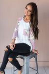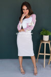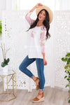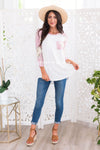 Grab this fun super soft stretchy floral top and say hello to comfort & style! This ivory and soft pink floral top features, an adorable baseball tee style, long soft pink floral sleeves, a rounded neckline, and a super soft stretch fit. Perfect for pairing with skirts or with jeans.