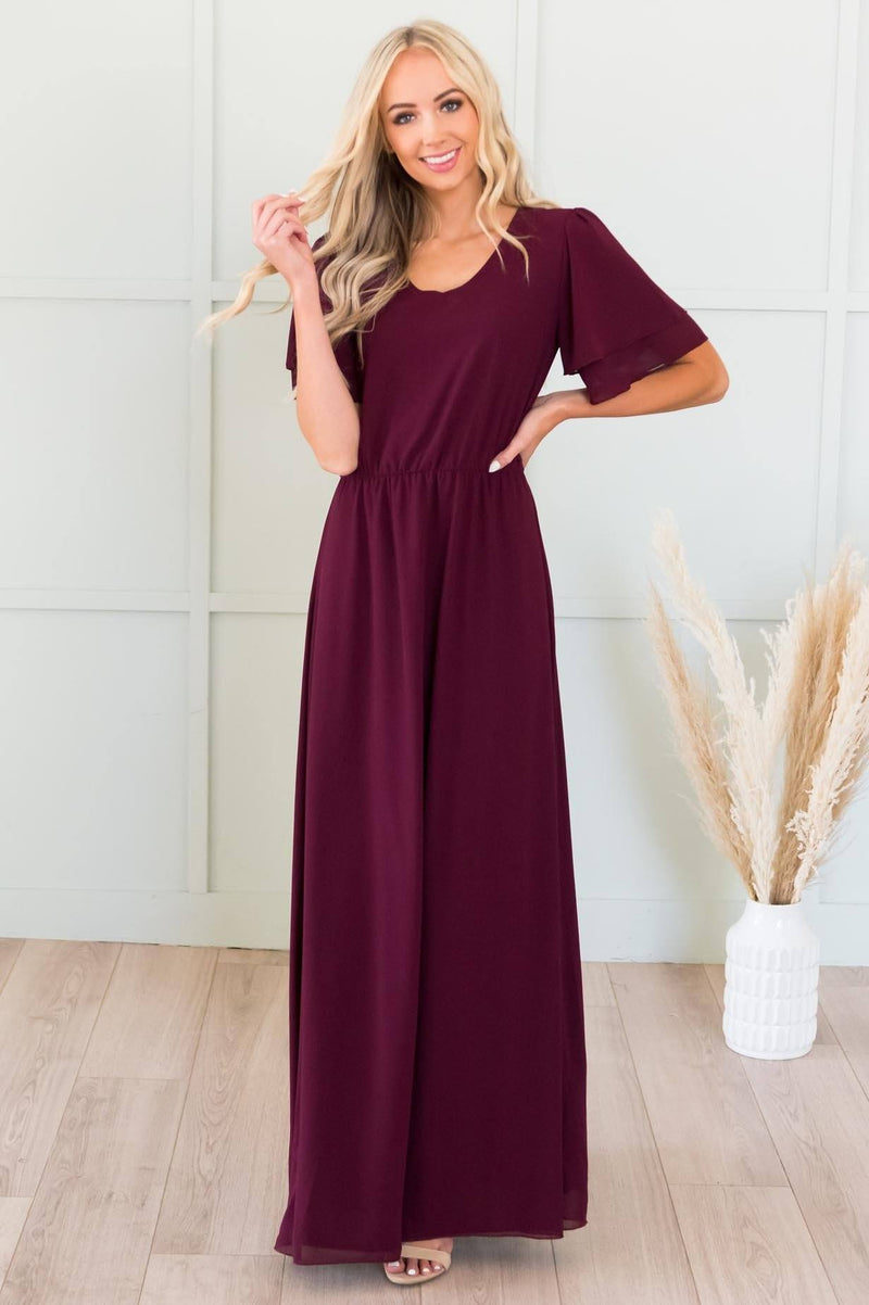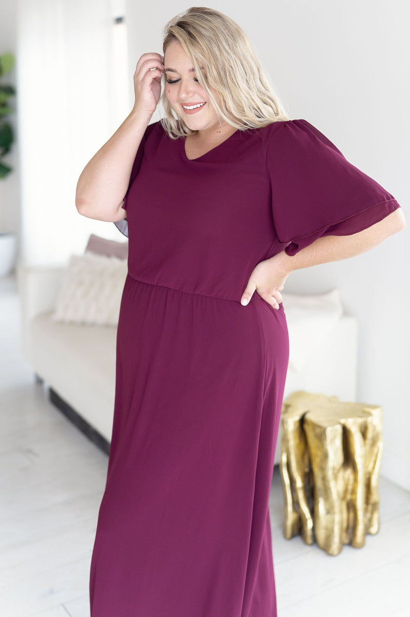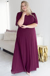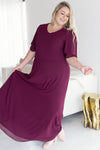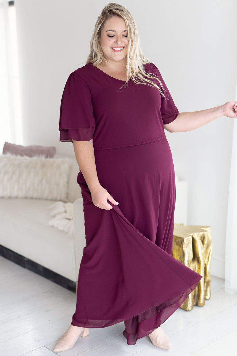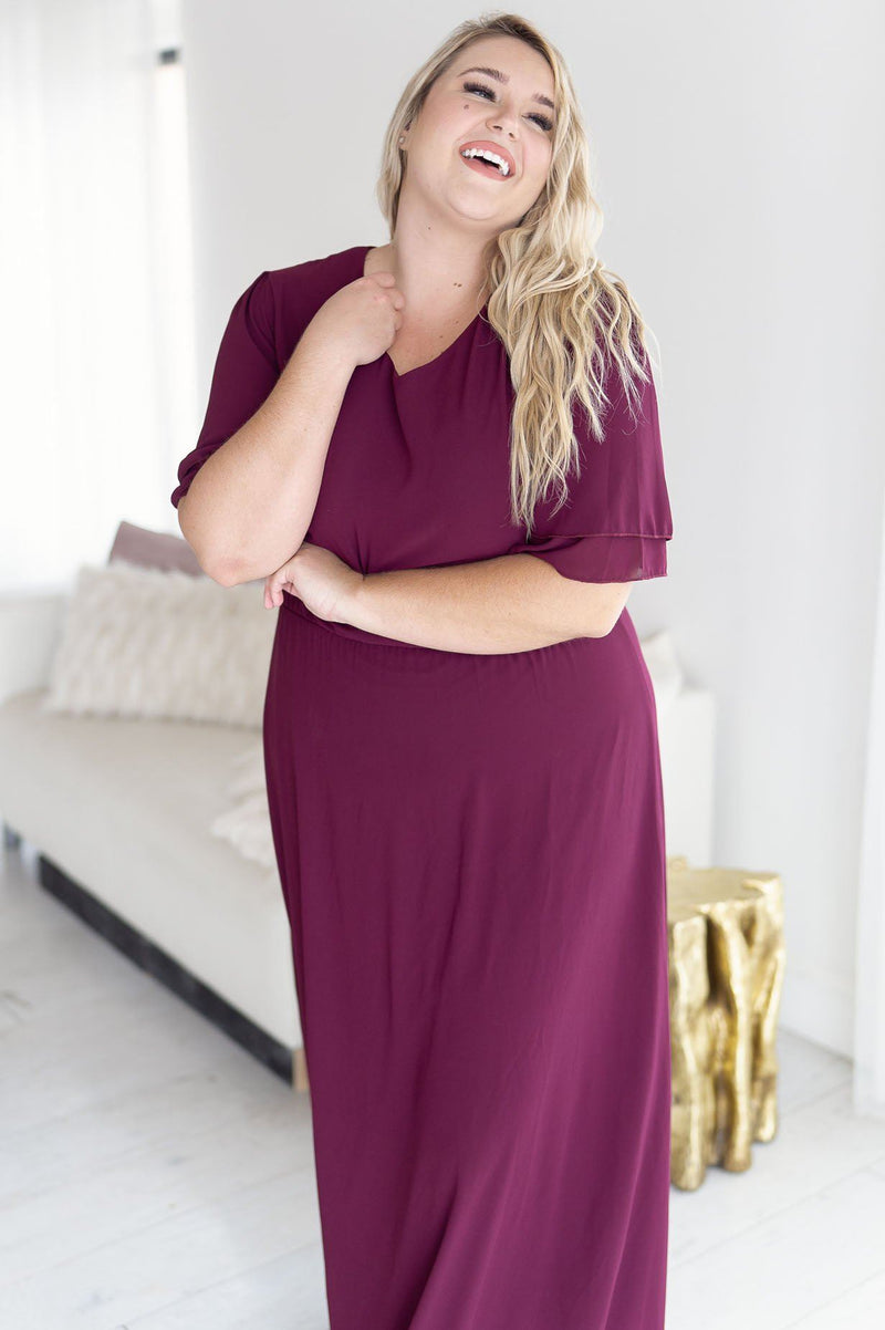 Elegant, classy and oh-so-beautiful! Our timeless chiffon Chloe Maxi Dress is a classic shade of deep plum, with an elastic waist, soft v neckline, and gorgeous tiered sleeves! Fully lined.
