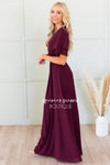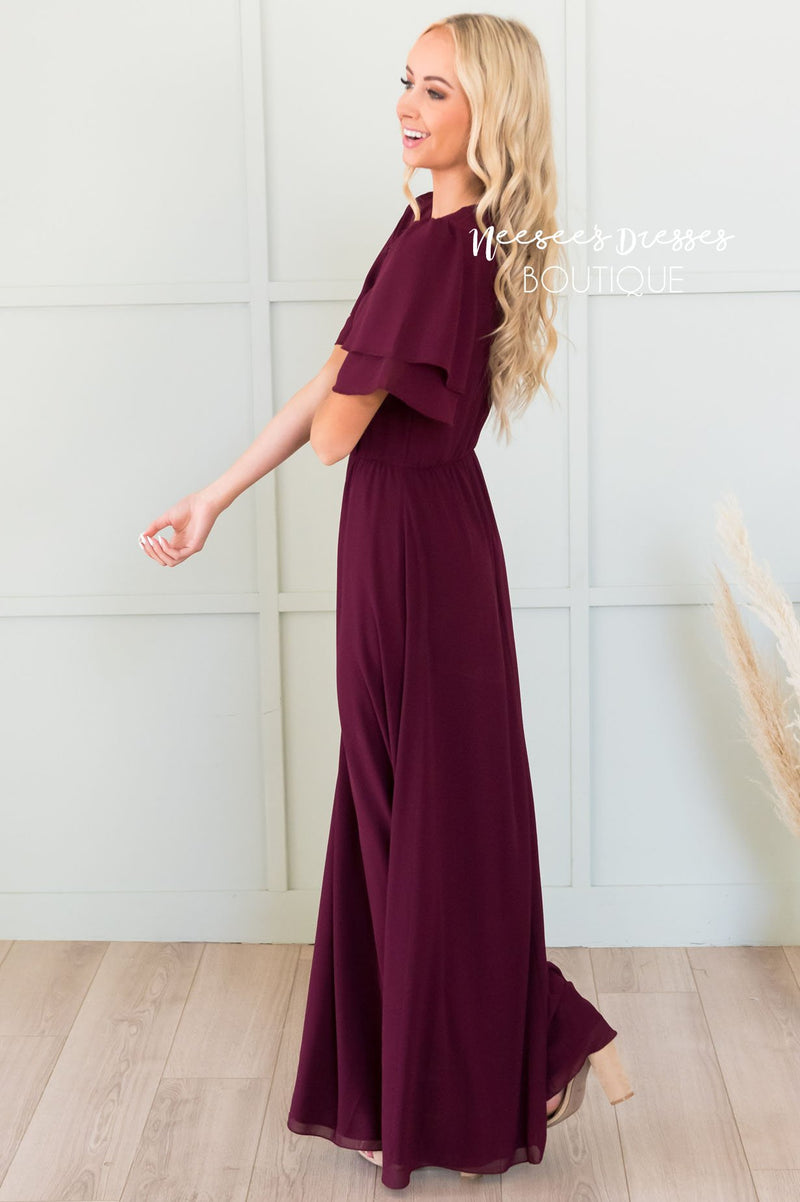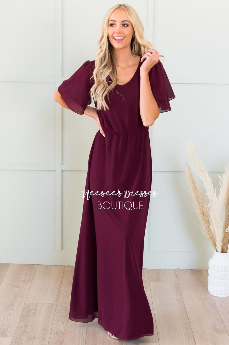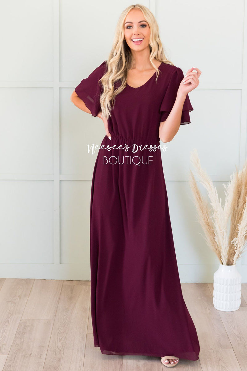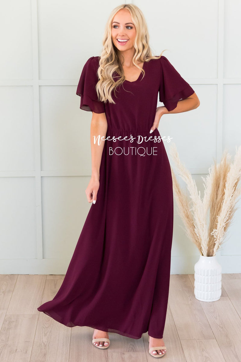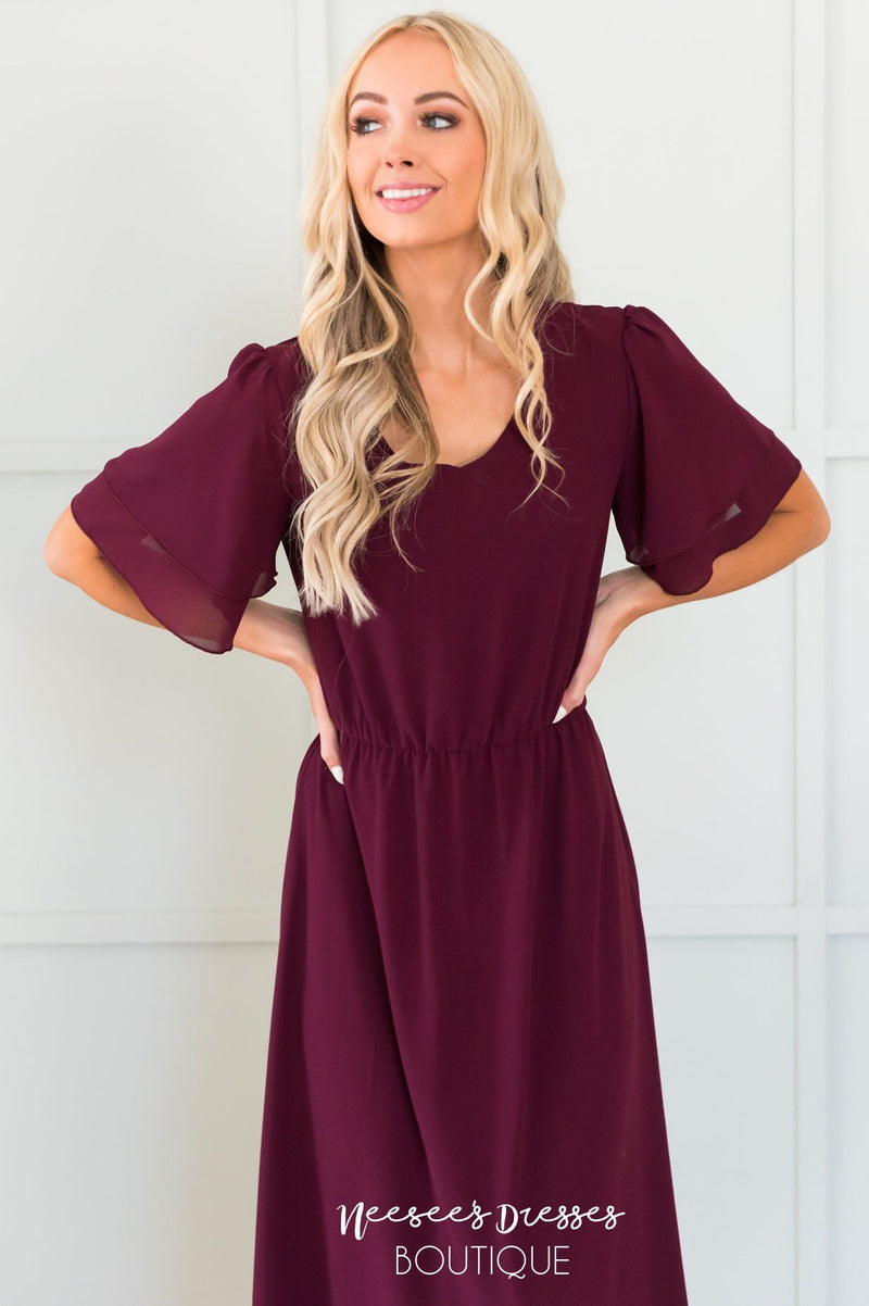 Elegant, classy and oh-so-beautiful! Our timeless chiffon Chloe Maxi Dress is a classic shade of deep plum, with an elastic waist, soft v neckline, and gorgeous tiered sleeves! Fully lined.