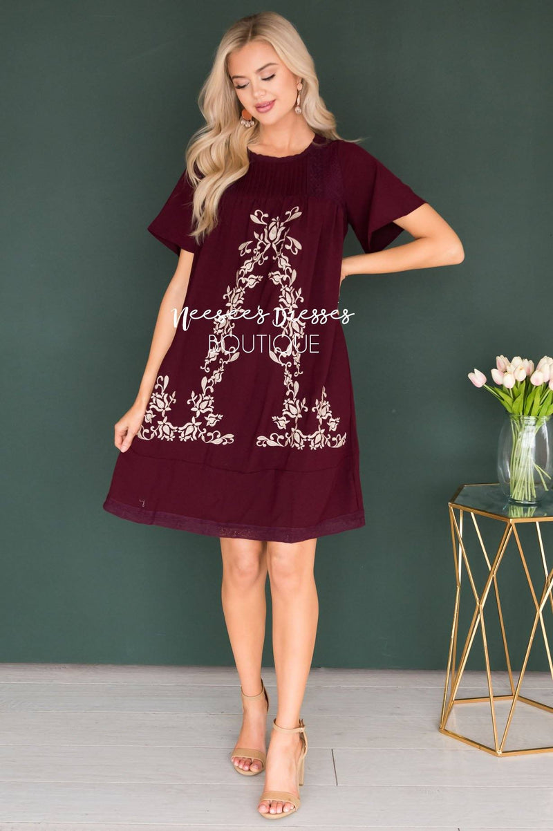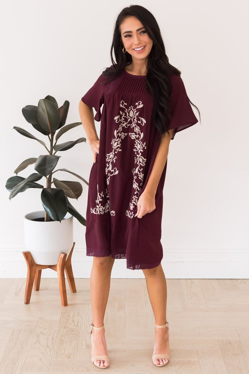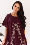 Add a little boho chic to your wardrobe with this adorable new dress! We are in love with all the simple details this dress has to offer! Deep Plum dress features a shift style fit, a lace and line detailed yoke, 1/2 length sleeves and beautiful ivory embroidered detailing. This dress is also lined.