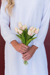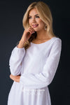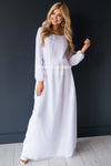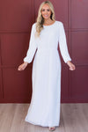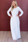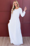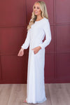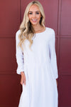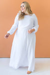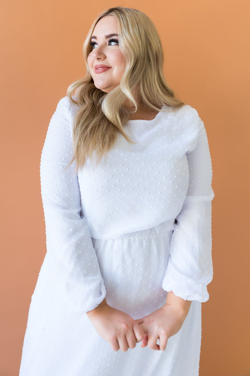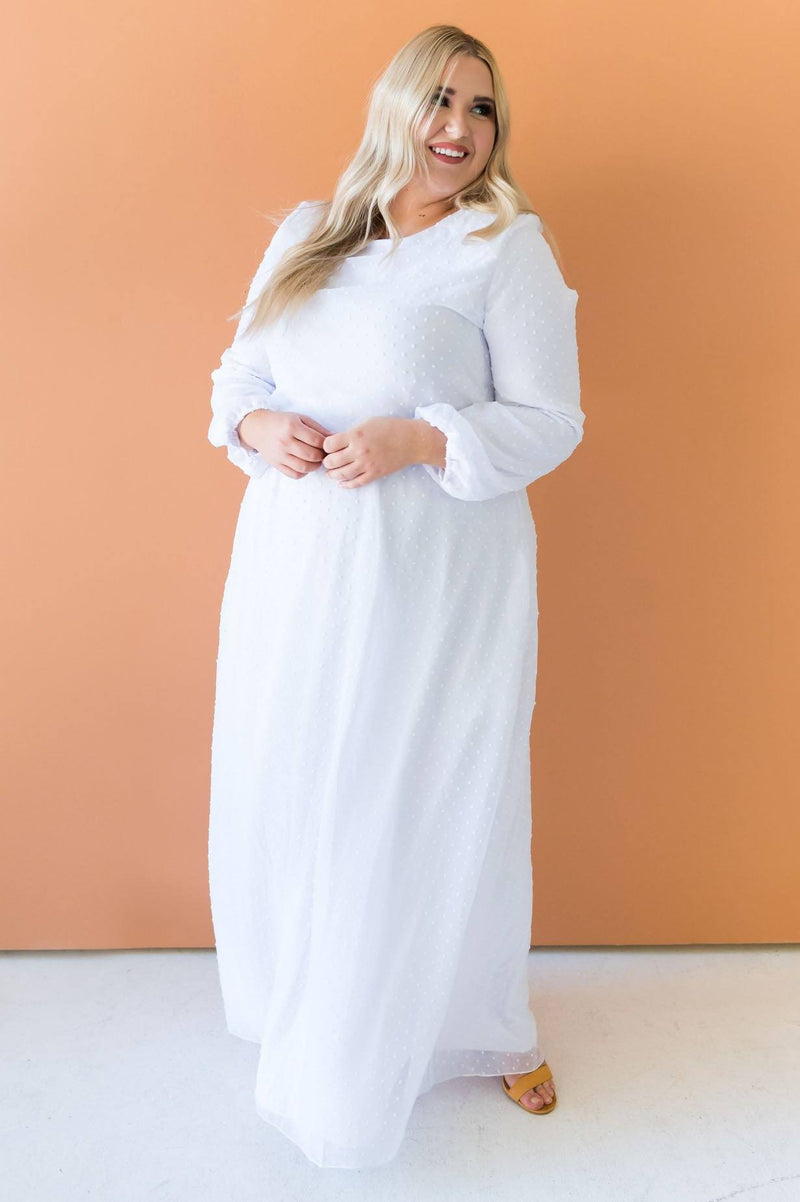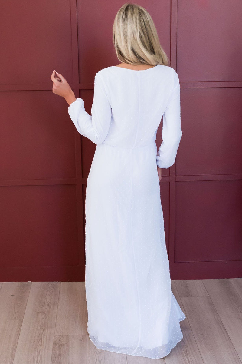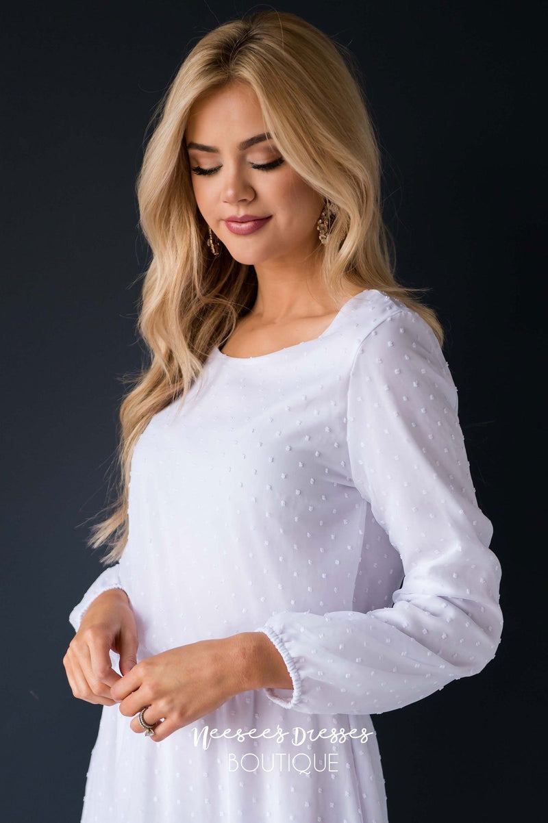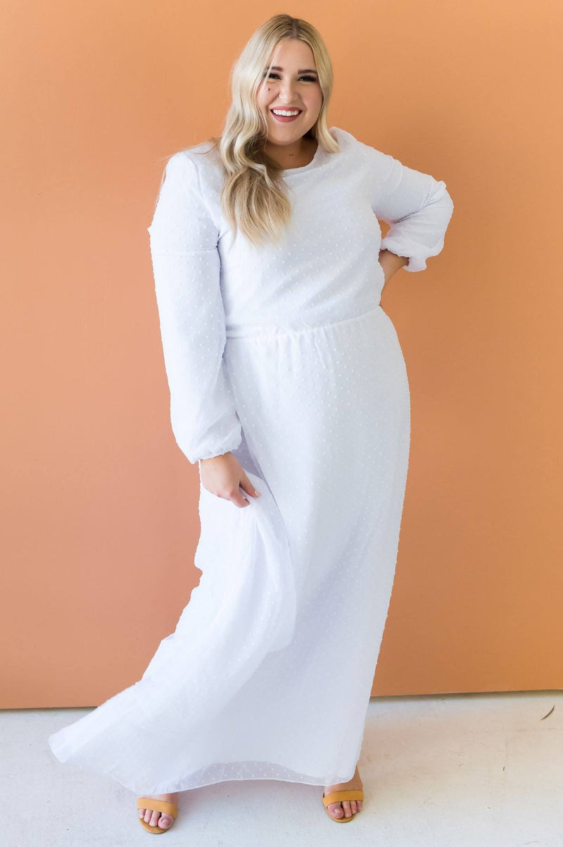Heavenly from head to toe. You will feel beautiful and peaceful in this pure white, lovely, swiss dot Temple Dress. Featuring a rounded neckline, long sleeves, fitted waist and full length maxi skirt. Fully lined.