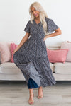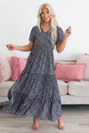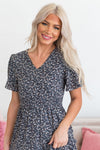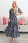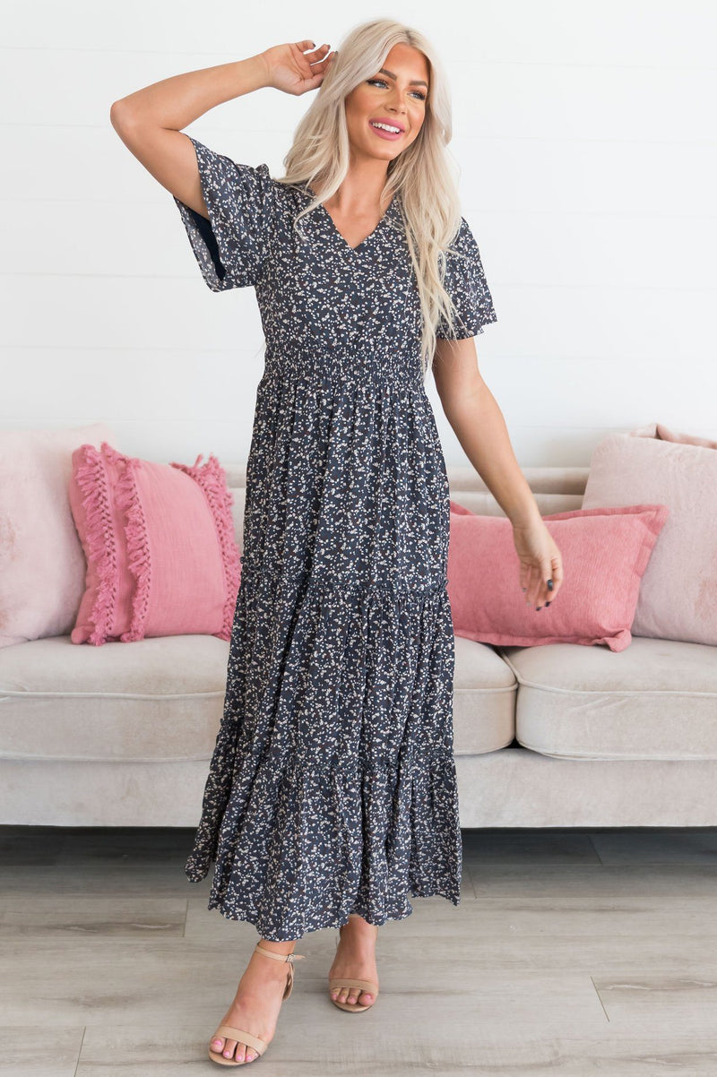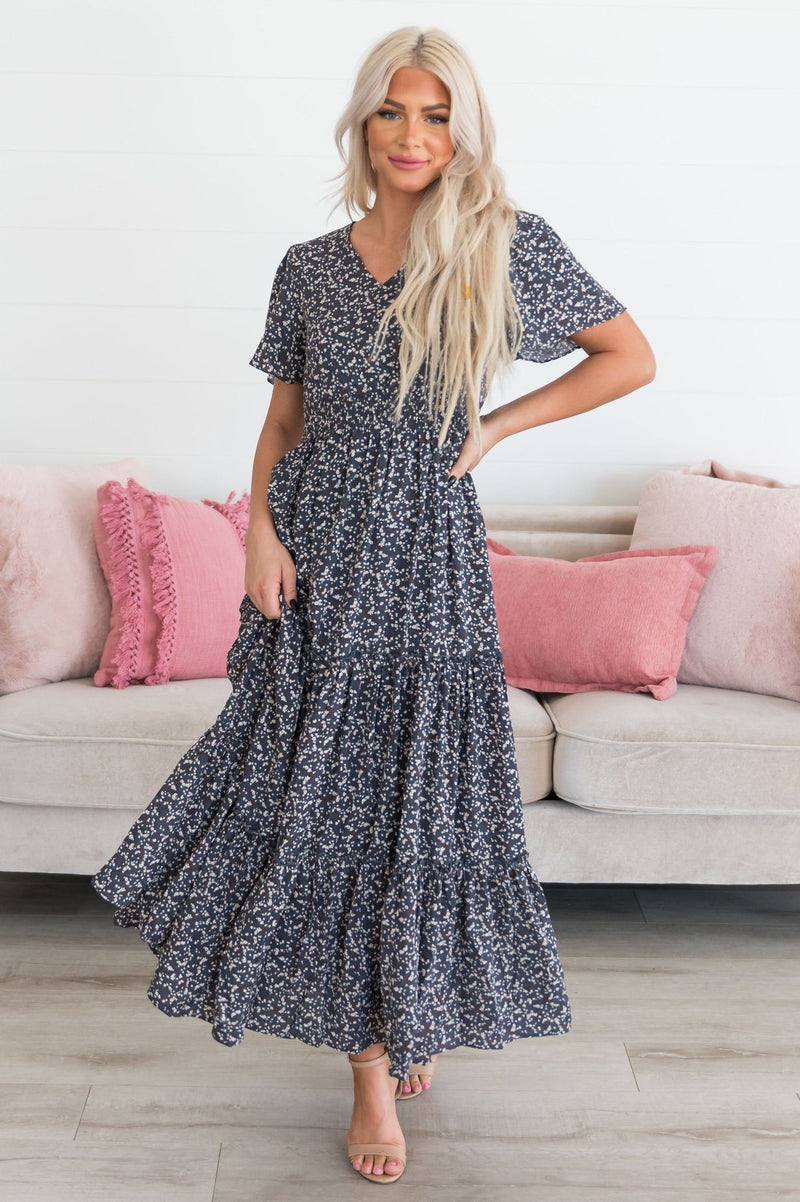 Elegance at its best! The darling new Eden dress has got our attention and we are sure it will have yours too! Soft V-neckline, gorgeous short flutter sleeves, a flowy ruffle tier maxi skirt, what more can we say?! This darling blue floral print has stolen our hearts! This dress is also fully lined except for those lovely flutter sleeves and has a shirred elastic waistband.