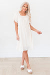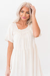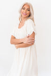 The Elliot is here and we are in love! Featuring a square neckline with smocked detailing, a gorgeous cream color, elastic waist, ruffled hem, and short flutter sleeves! We can't get enough of this beautiful new arrival! Get yours soon!