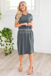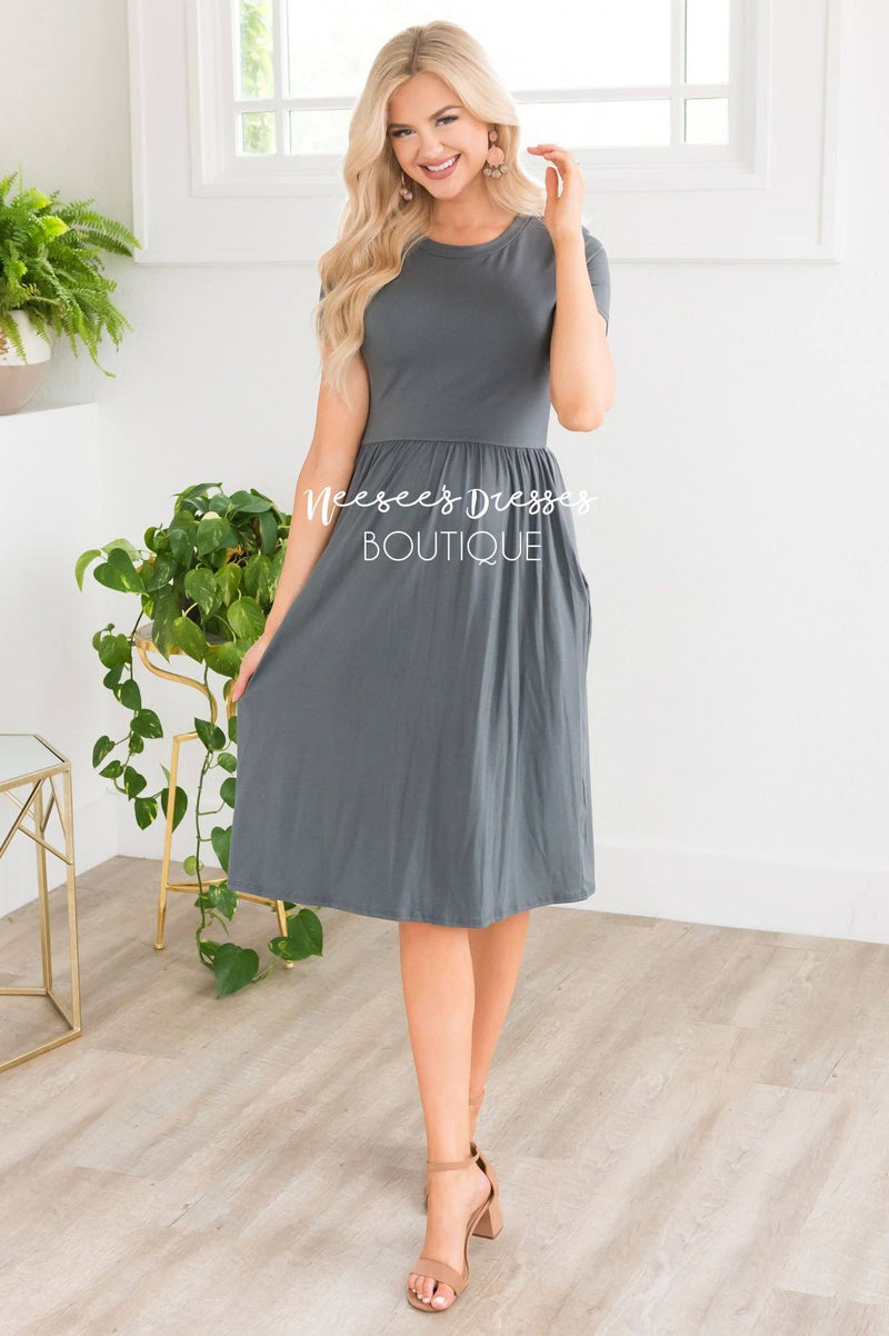 The Winnie dress is one you are going to want to join your wardrobe! This modest solid color beauty is made out of the softest ever material! Featuring a rounded neckline, short sleeves, elastic waist, pockets and the perfect modest mid-length! Get yours today!
