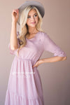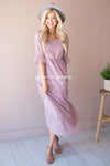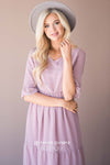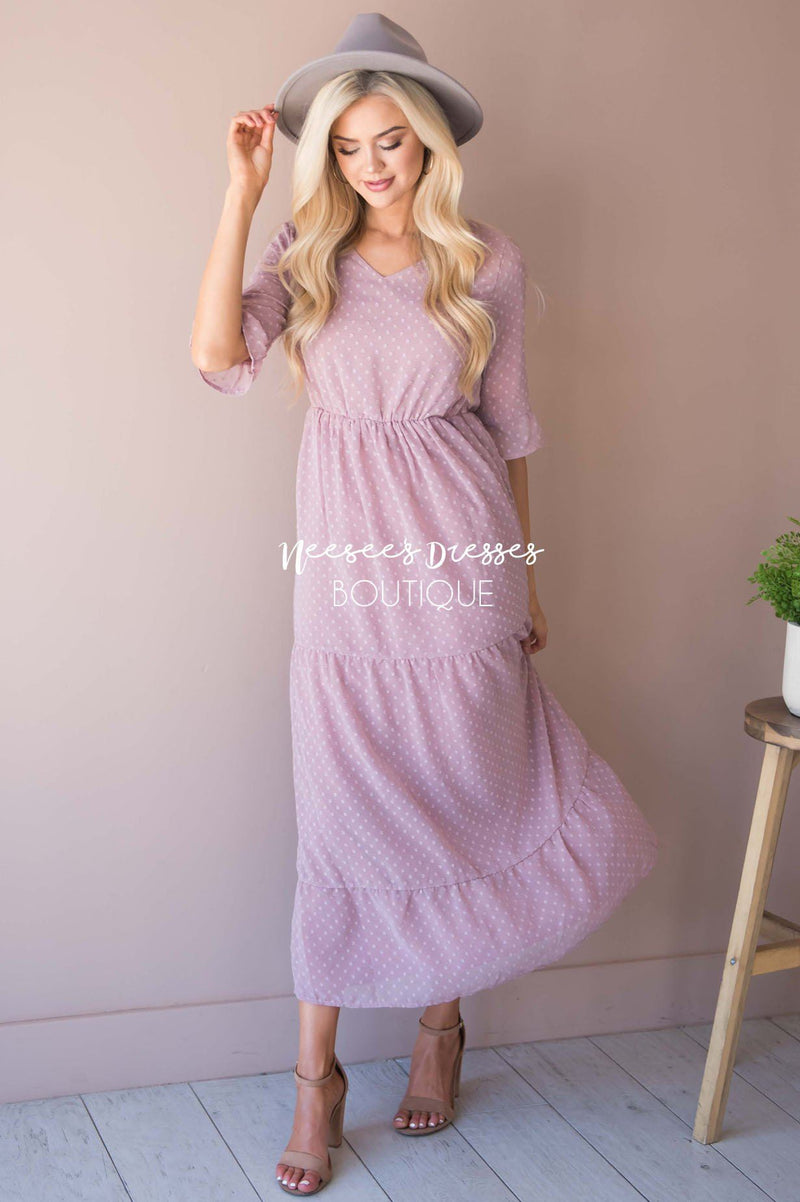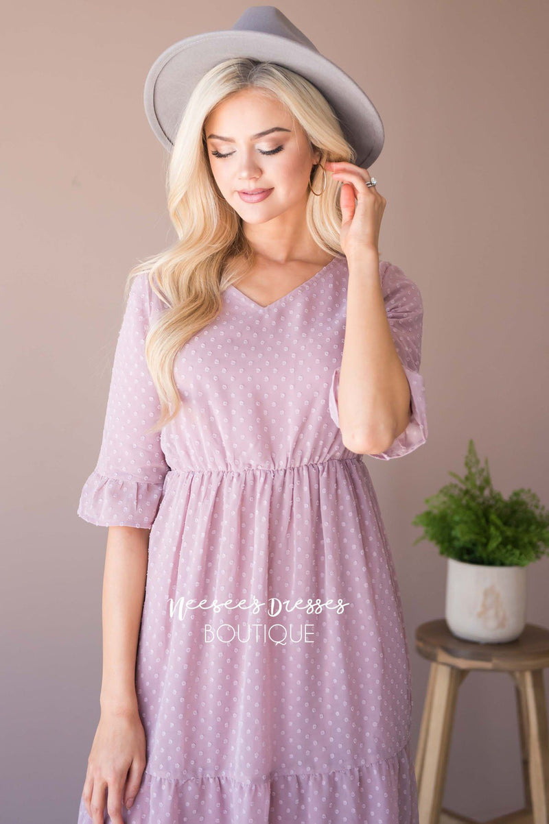 The McKenzie has stolen our hearts, this delicate romantic dress was made for date night ! We are loving the soft feminine touch this dress adds to any occasion! Soft lilac dress features a dotted textured fabric, a v neck line, half length bell sleeves, a fitted elastic waist and full length maxi skirt. This dress is also lined.