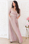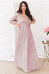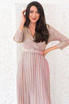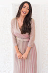 The new Kaytee has all the very best features, we are completely obsessed with this gorgeous shimmering beauty! Features include a crossover bodice, 3/4 length sleeves, pockets, pleated maxi length skirt and the perfect belt accessory! Get yours today!