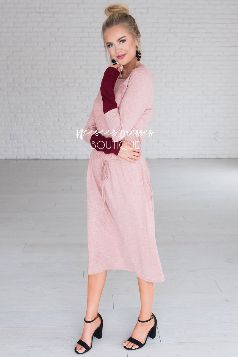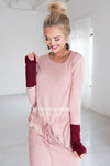 We are obsessed with our new Blake dress! It is absolutely perfect for the fall season. We adore the thumb hole detail of this cutie. It also features a round neckline, elastic waist band, false drawstring tie detail, pockets and sweater sleeve material. These won't last long!