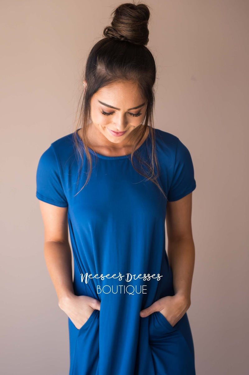 The perfect swing dress just arrived and we couldn't be more excited about it! This beautiful bright navy dress features short sleeves, a round neckline, flattering swing style fit and side seam pockets.