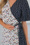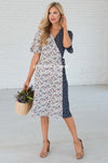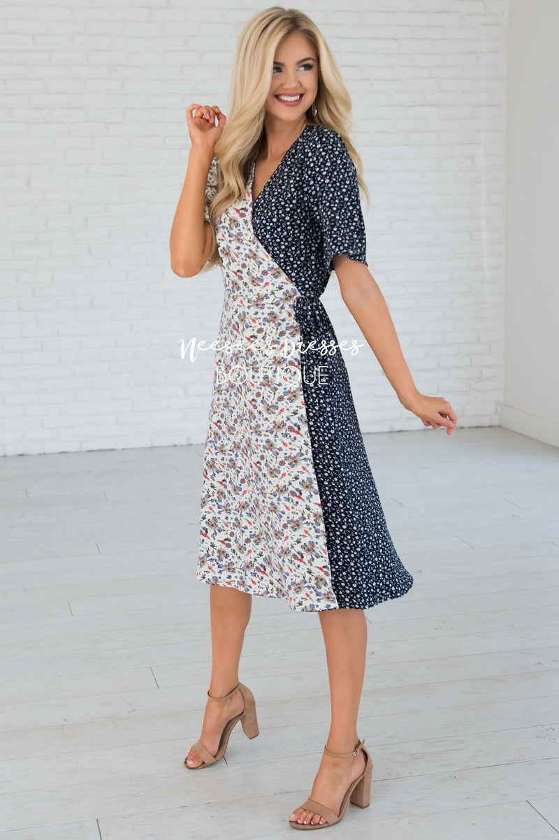 This gorgeous new knee length midi will blow you away! The Whitley is a gorgeous wrap dress that features a functional side tie, & flowy feminine sleeves! The contrast of ivory & navy multi floral detailing gives this dress its own character! Get it today, it is too cute to pass up!