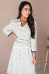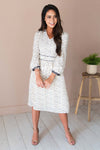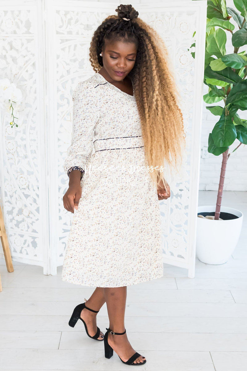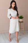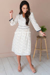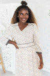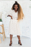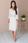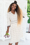This gorgeous new knee length midi will blow you away! Our gorgeous new Sapphire dress features, a v-neckline, 3/4 length sleeves, a navy trim waistband, and a flowy feminine fit. We hope you love this midi as much as we do, get it before it is all gone!