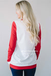 The perfect Christmas Sweater! Soft, cozy and so cute! White sweater features red sleeves and a colorful plaid reindeer.