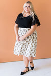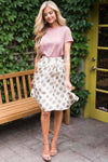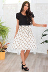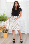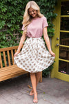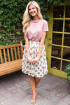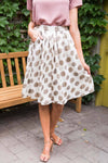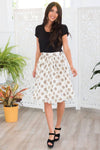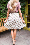 Add the perfect touch to your fall wardrobe with this new medallion pattern skirt! This gorgeous cream skirt is such a chic way to add a little flair to any occasion! Featuring a fitted waistband, side pockets and is fully lined.