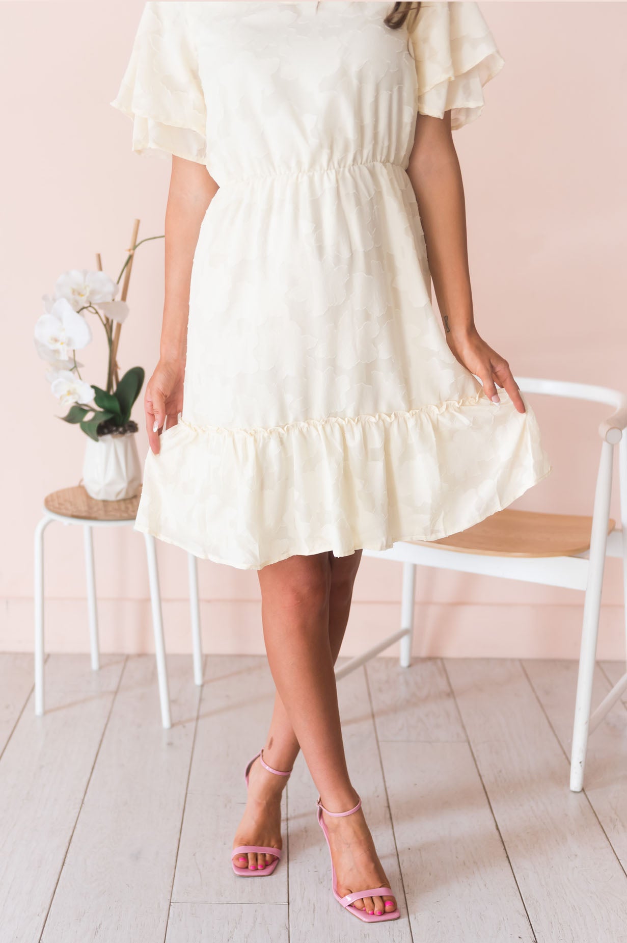 We are head over heals for this feminine beauty! The Magnolia has the most gorgeous textured floral fabric, soft v-neckline, half double flutter sleeves, elastic waist and a darling ruffle hemline. This one is an absolute must have!!!