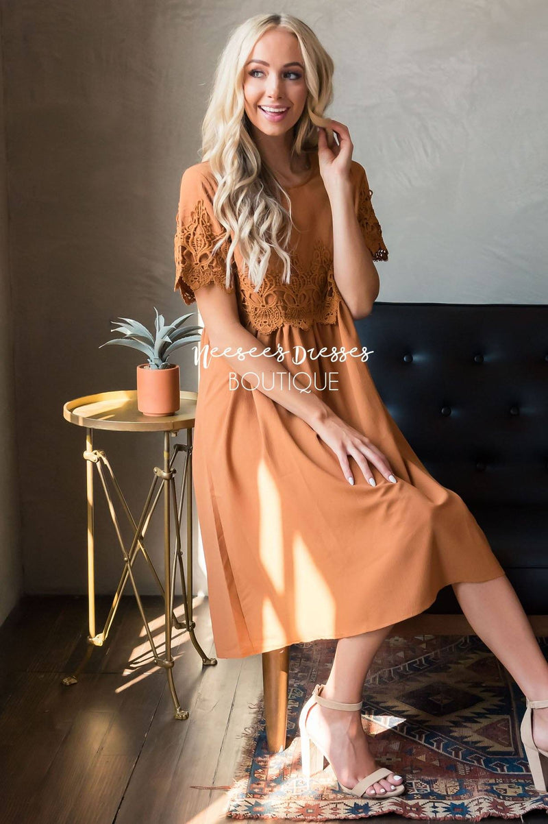 We are excited to share with you, The Remy is back and just as Gorgeous as Ever!!! A fan favorite so popular, we couldn't help but bring it back! This modest mid length tea dress features pretty lace detail across the bodice and arms for the perfect feminine touch. It truly is the ideal dress for any occasion!