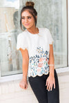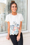 This delicate blouse is perfect day or night! Featuring lovely eyelet material with an embroidered floral detailing and scalloped trim that creates the softest feminine touch! White top features a round lace detailed neckline, short sleeves, and a keyhole button closure. Get yours today!