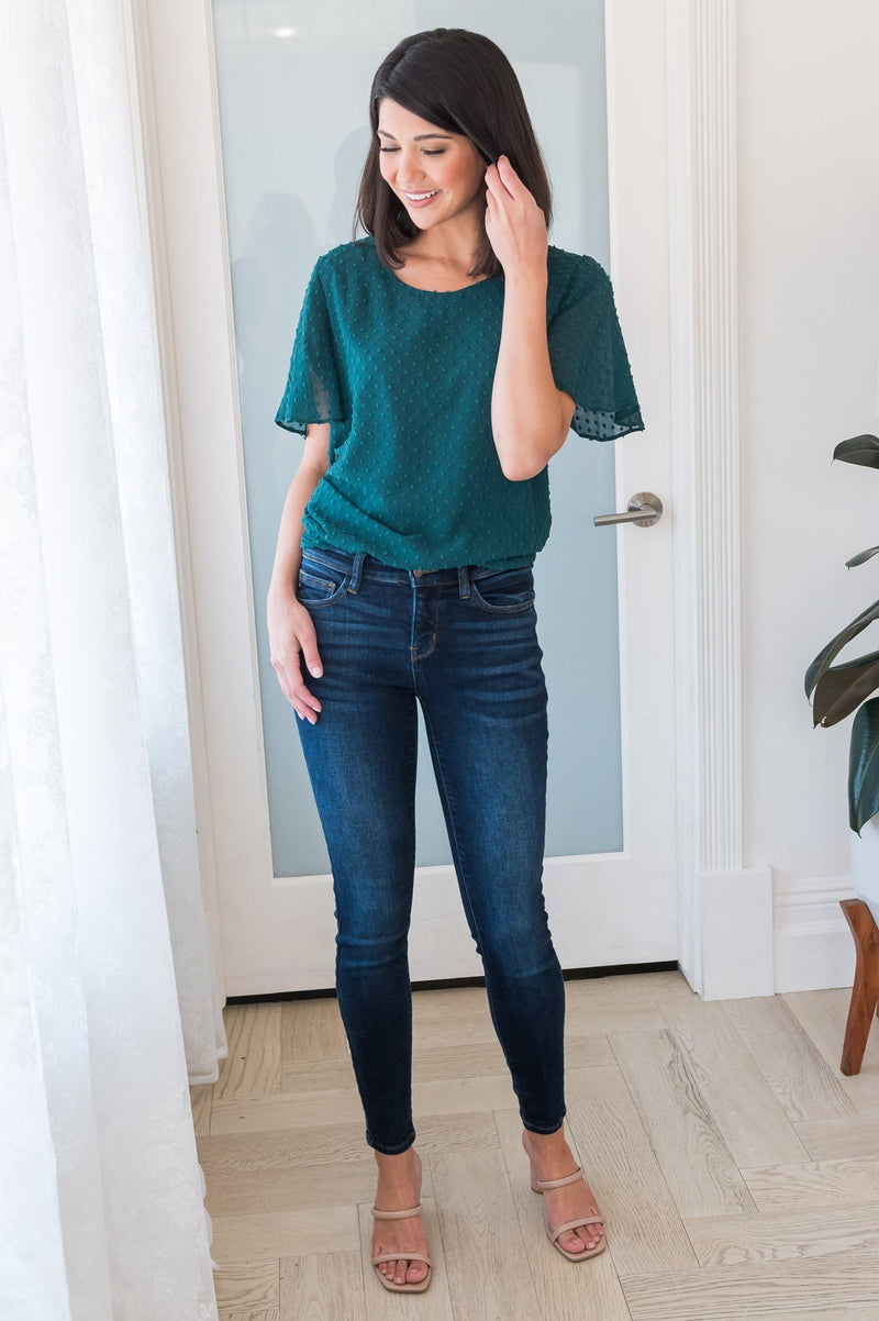 This delicate blouse is perfect day or night! Featuring a textured swiss dotted print that creates the softest feminine touch! This emerald green top features a rounded neckline, half length flutter sleeves, and is fully lined.
