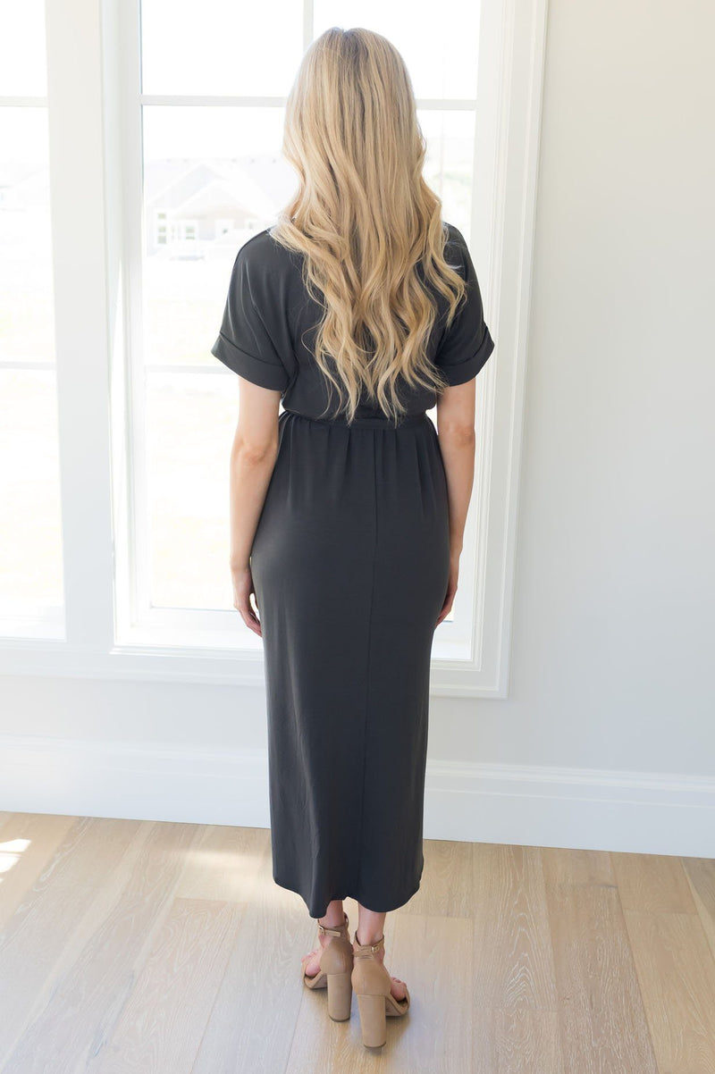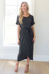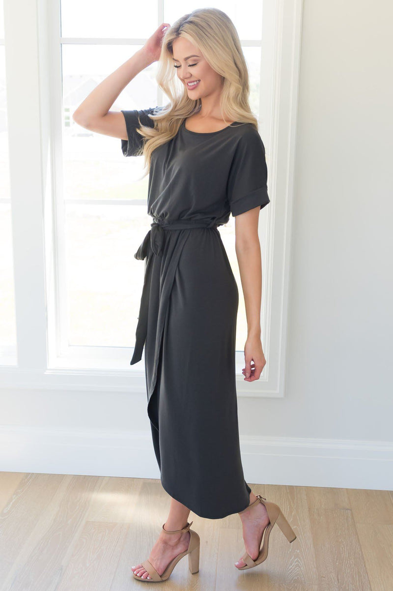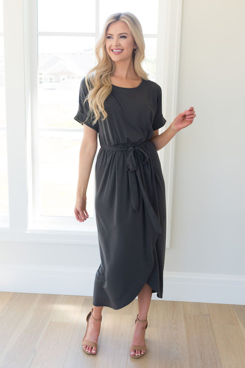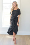 We run out of flattering words to use when describing the new Asia Dress! It's so comfortable and easy to wear, the perfect addition to everyone's closet. Featuring a rounded neckline, short cuffed sleeves, belt tie waist and high/low wrap style skirt. Just say yes to the dress and get it today!