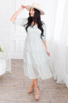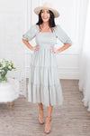 The Greta modest dress is perfect from top to bottom! We adore the tiered skirt, square neckline and smocked bodice beyond measure! The soft sage color and linen material together creates an elegant, yet boho feel! The quarter length sleeves are oh so pretty!