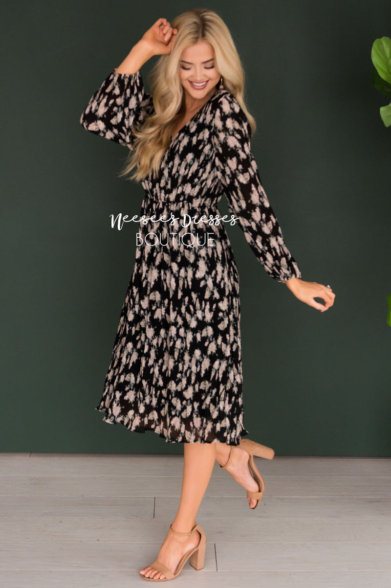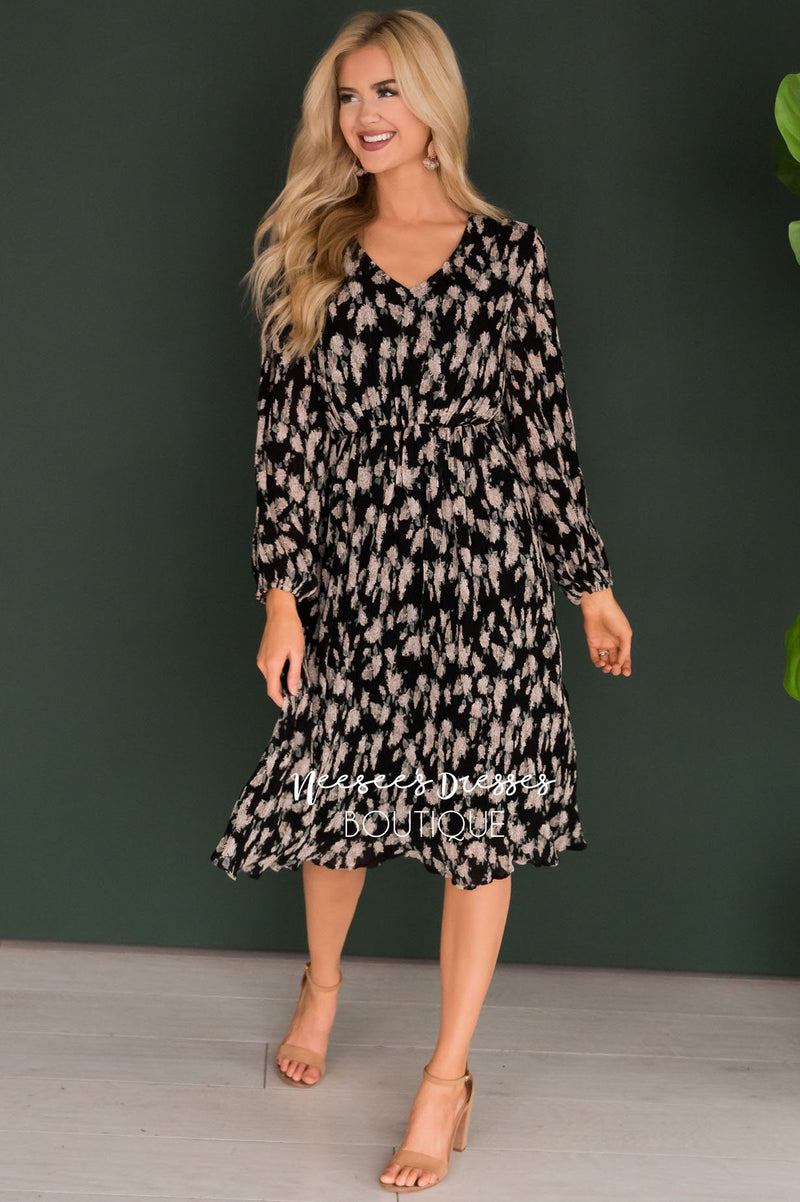 So comfy and cute, there is no way you could go wrong with this dress! Dress it up for a night out or keep it casual for a fun day of shopping. Features the most elegant flowy crepe fabric, a v-neckline, long puff sleeves, an elastic waste and is lined everywhere except the arms.
