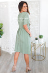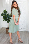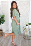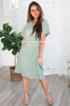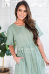 We are obsessing over this soft shade of sage, it is so fitting for any season! This cute dress features lovely textured material, round neck line, short sleeves, dress slips on, has a relaxed fit & pockets, talk about a win-win! Imagine all the cute combos you can create with this modest gem!