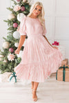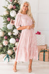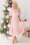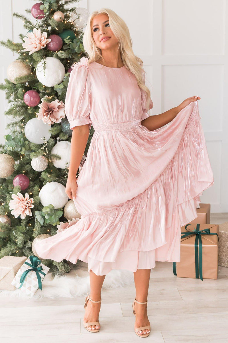 This gorgeous modest maxi dress is bound to steal everyone's hearts! We are obsessed with the shimmery blush color! Features feminine puff sleeves with lace detailing, elastic waistline, and lovely flowy tiered skirt! Get yours fast because these will go quick!