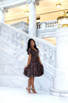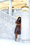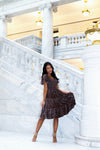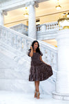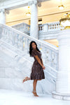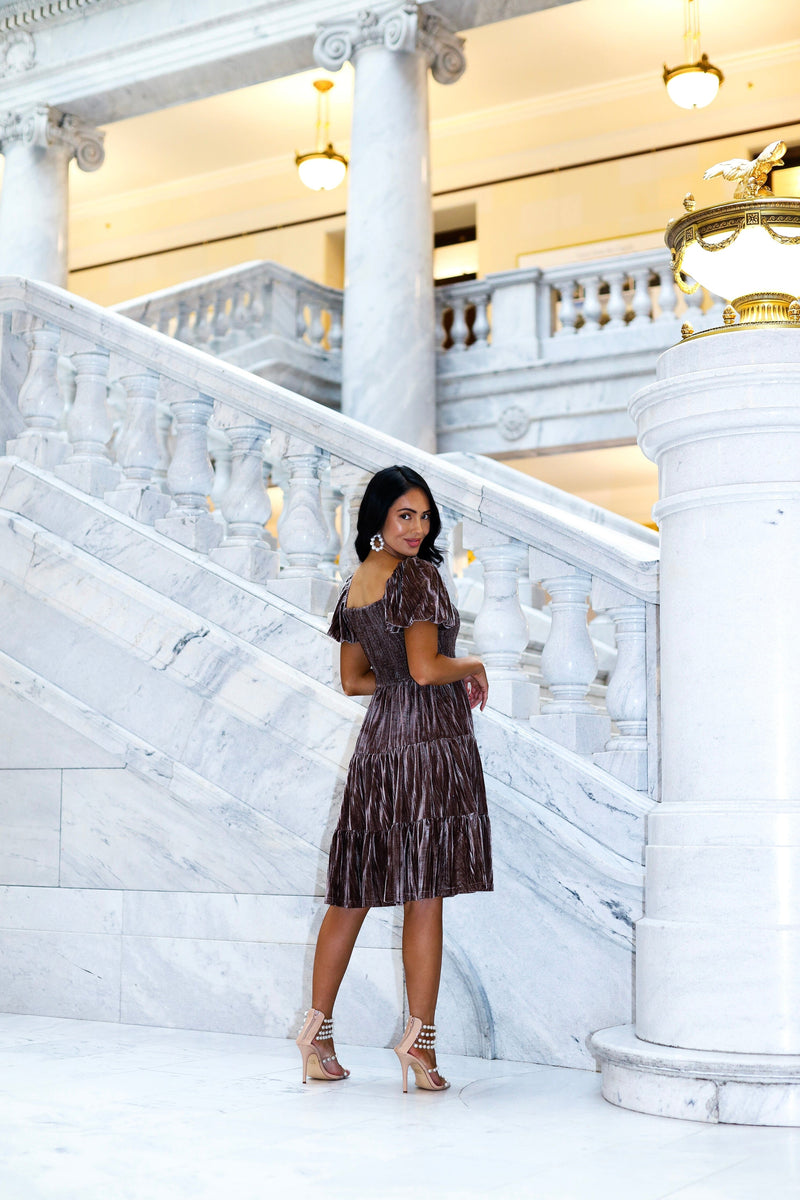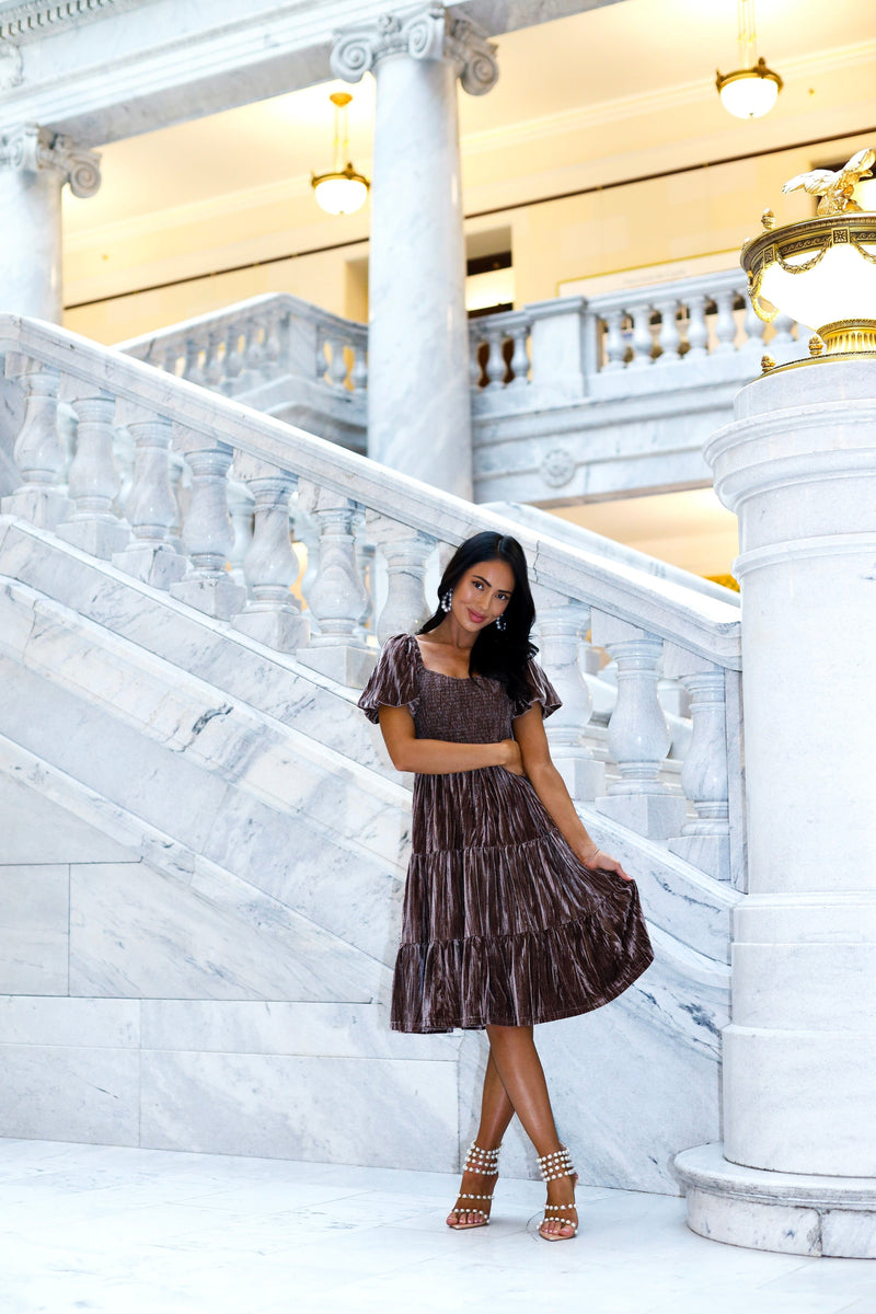 The Franny is all classy with a little sass! This lovely smocked dress has stolen our hearts and the show as you can easily see! Features include, gorgeous taupe velvet fabric, squared neckline, smocked bodice, short bubble sleeves and tiered skirt. Get yours before these gems are gone for good!