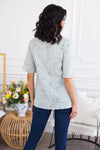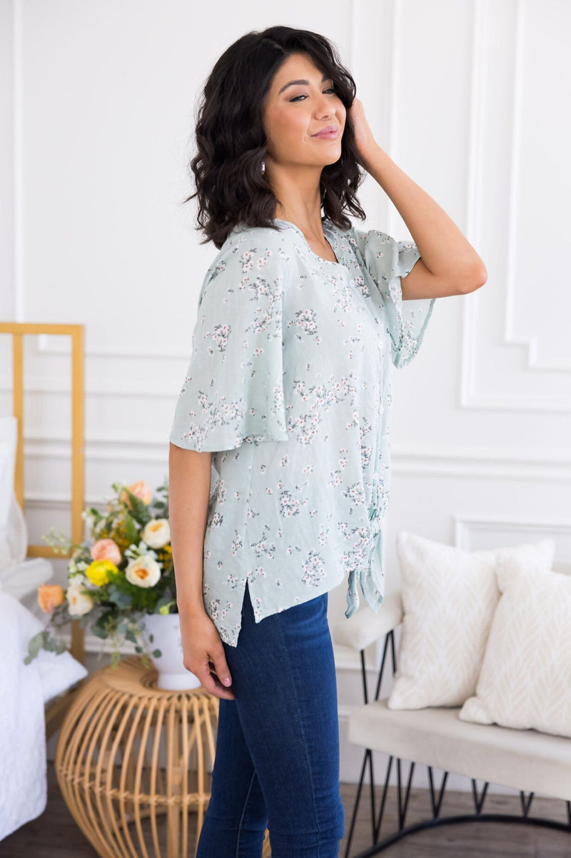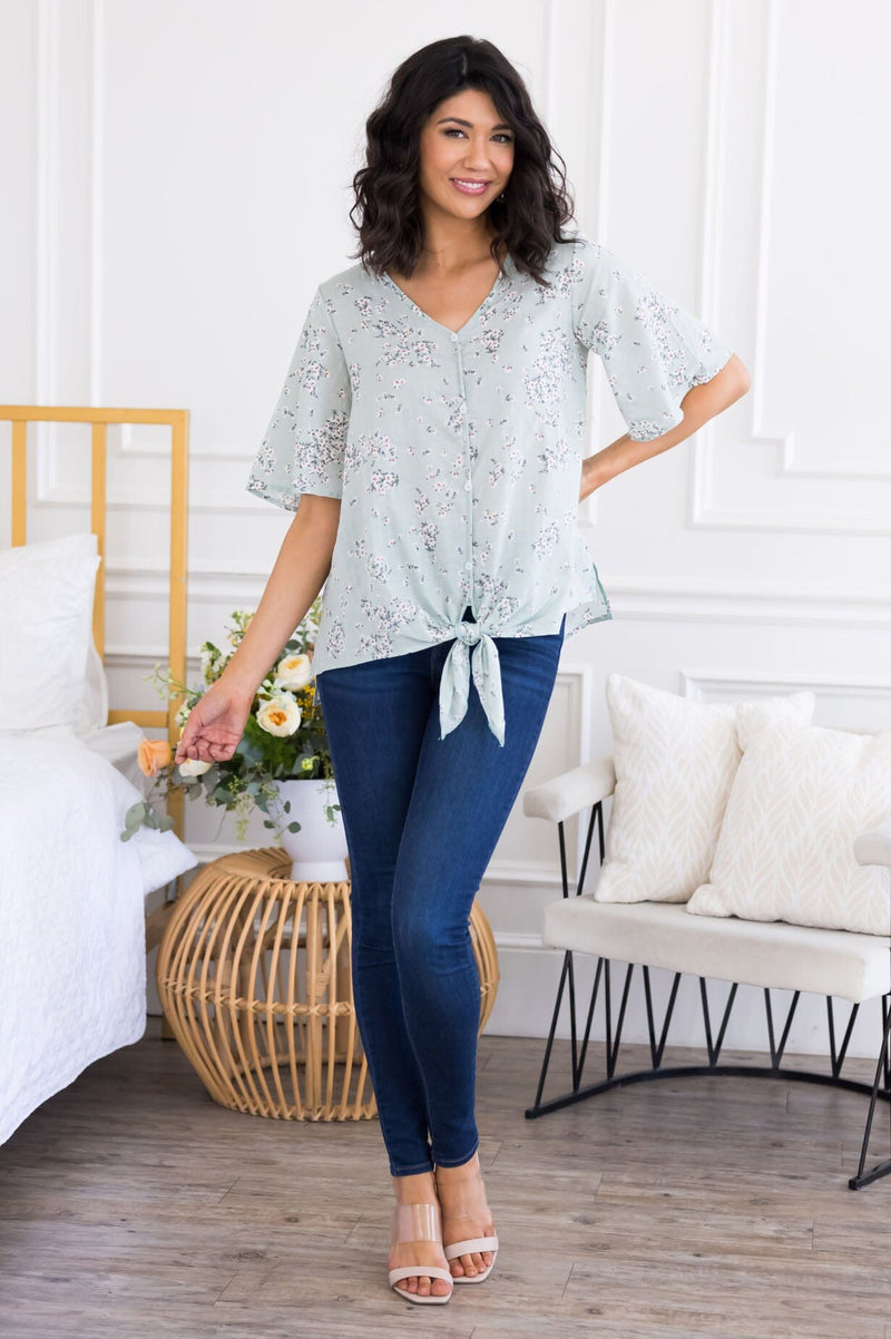 The new Photo Ready Top is so soft, so cute, and ready to pair with your favorite jeans or tucked into a skirt for your Sunday church outfit. Features a faux button front, gorgeous floral print, half length flutter sleeves and the most precious tie detailing. Grab yours today!