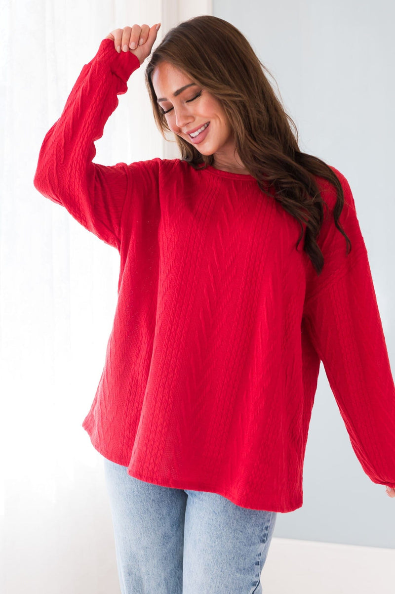 Our Bringing The Cheer Modest Sweater is the perfect sweater for the this holiday season! The beautiful red color, soft cable knit fabric and long sleeves we simply can not get enough of! Make sure to get yours today!