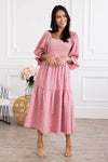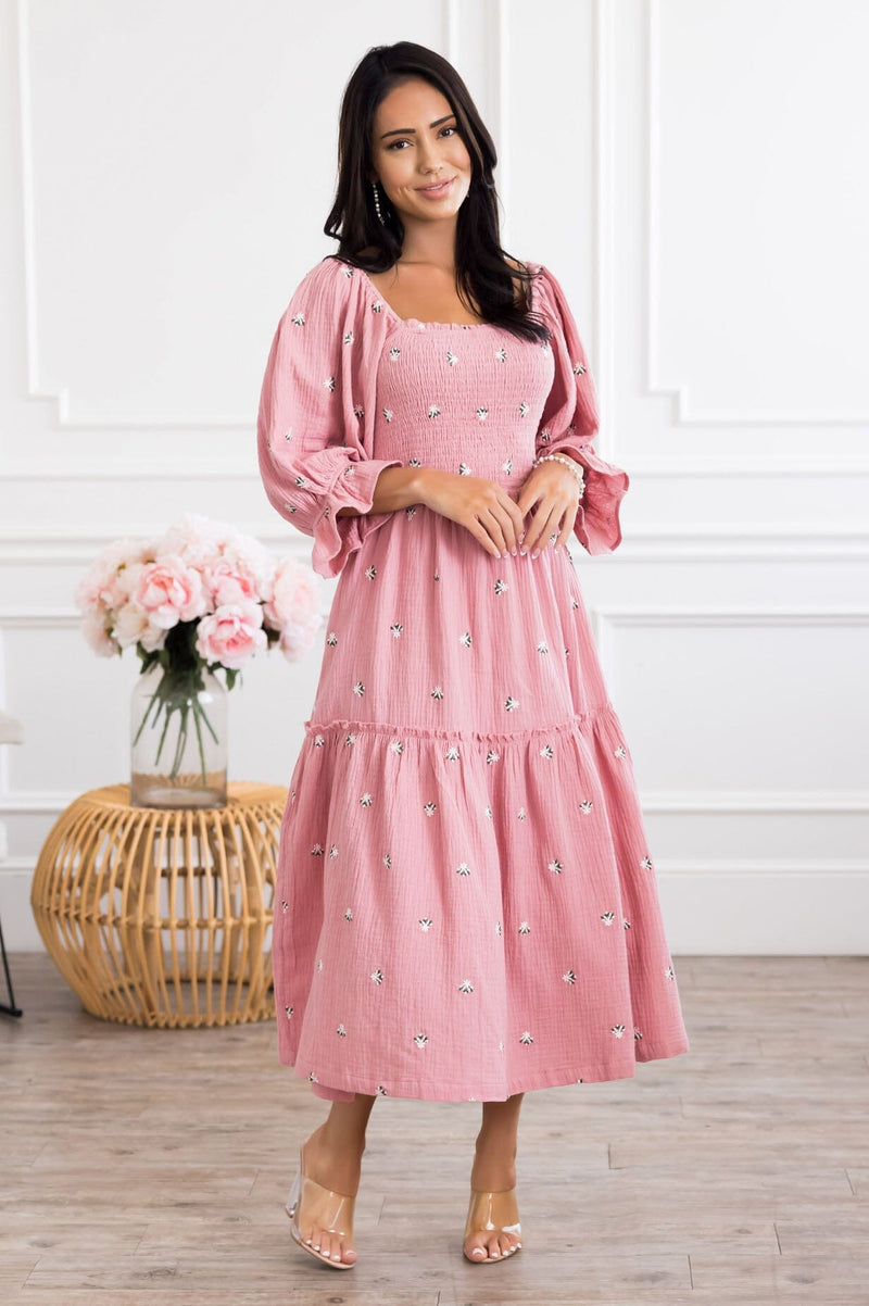 Prepare to have your breath taken away! The perfect dress *does* exist: Meet our modest Bates Dress. This breathtaking dress features a square neckline, gorgeous quarter length ruffled sleeves, smocked bodice for a comfortable fit, a drop ruffle hem and the loveliest floral embroidery detailing, it is simple yet so delicate!