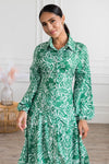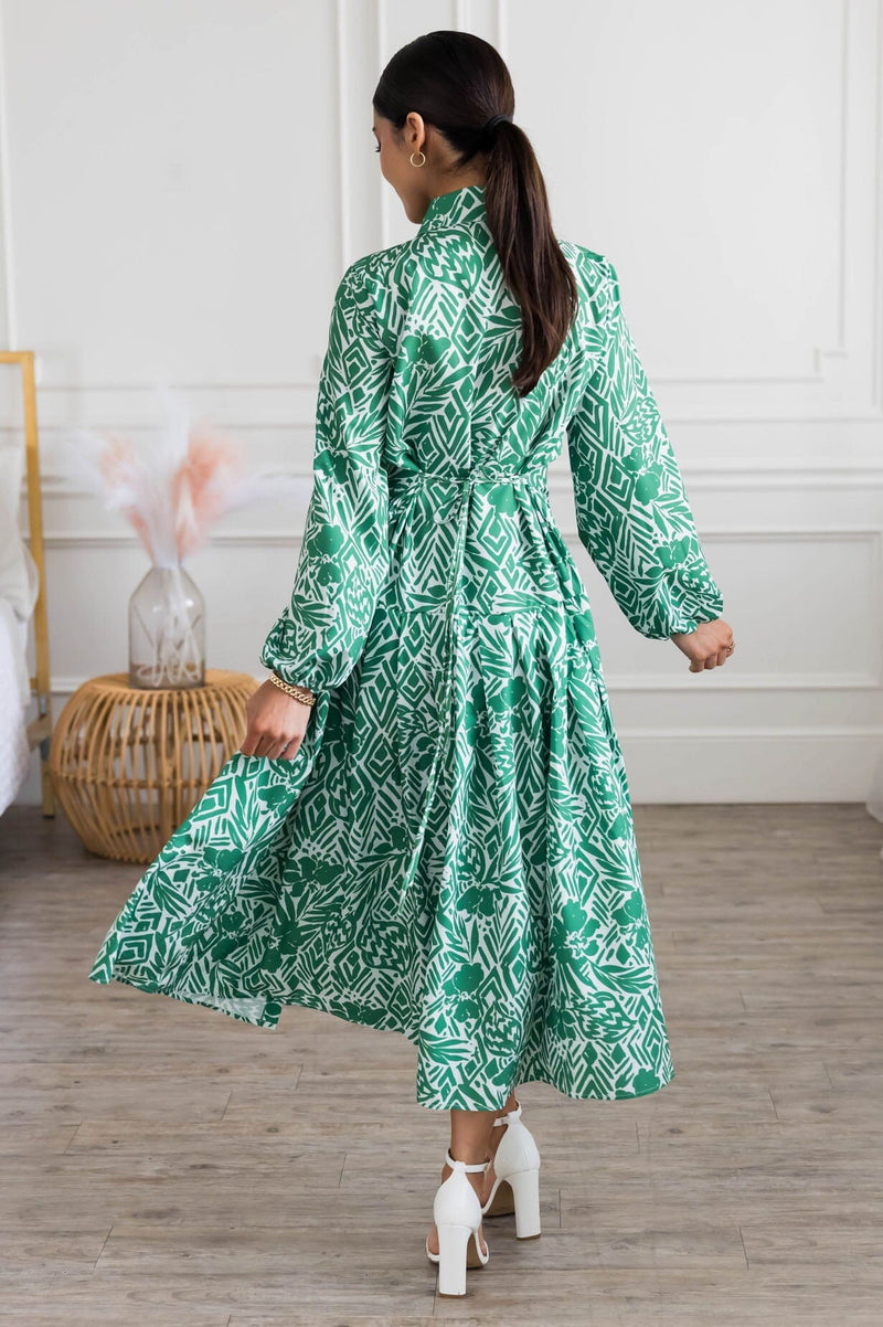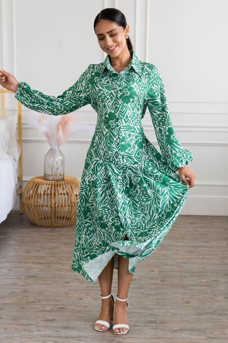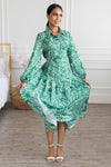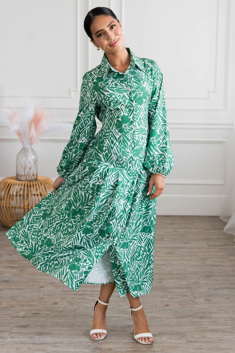 The bold a-line Fallon is beyond beautiful! We are so in love with the stunning green floral and feminine modest fit, we simply can not get enough! Also features, a lovely collared neckline with functional button front, tie back and the perfect length flowy skirt. Get yours today!