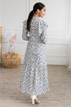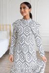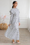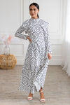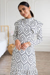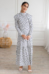 Don't sleep on this one, we know an instant sell out style when we see one! Our beautiful geo print Macdara dress, features a modest mock neckline, with lovely yet oh so unique shoulder ruffle, long sleeves zipper back closure and a lovely ruffle hem skirt.