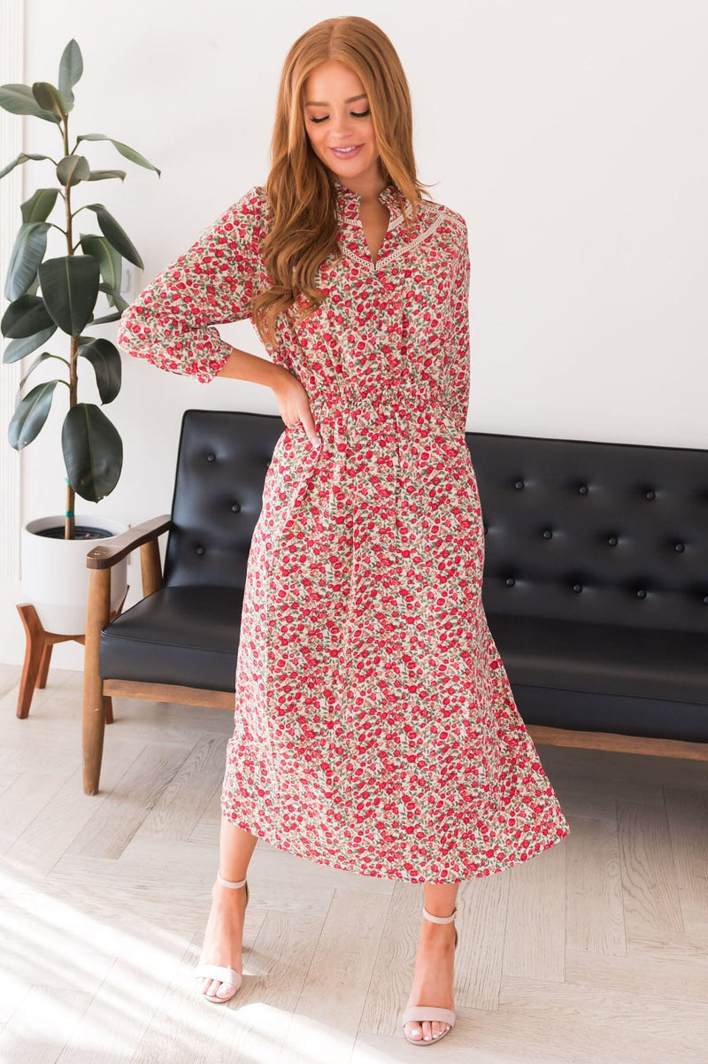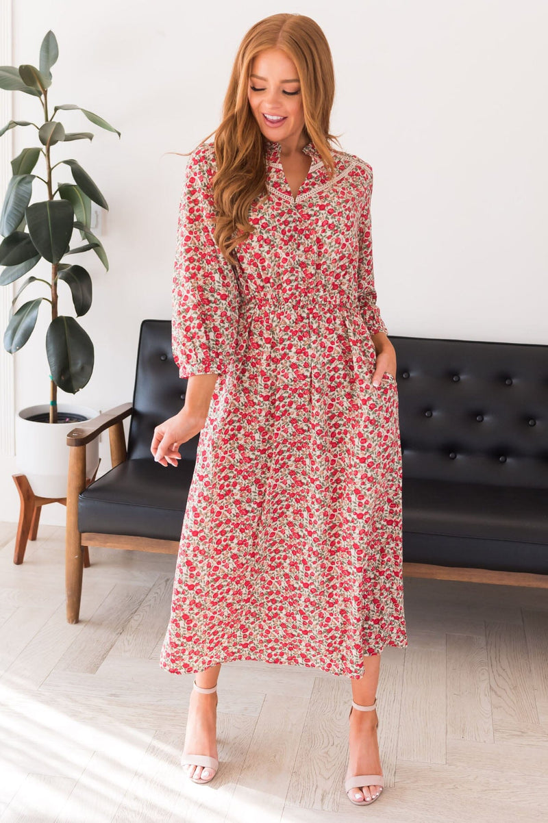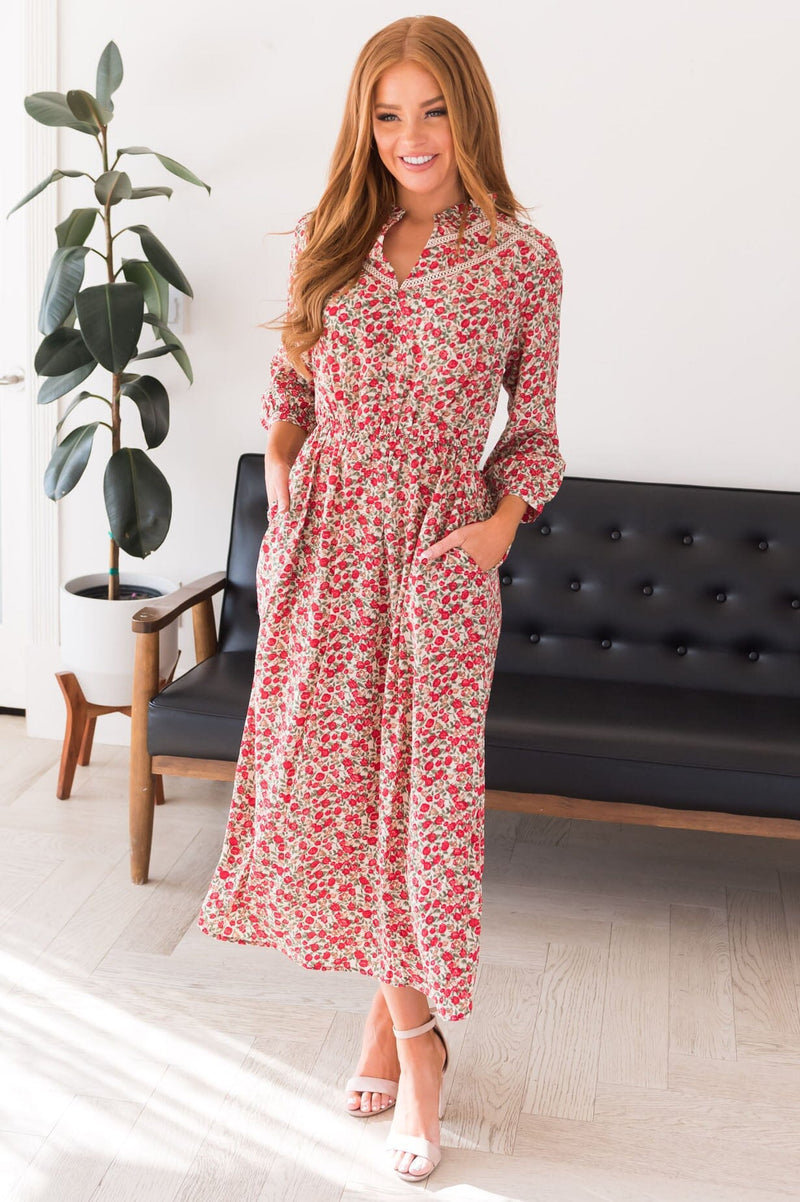Be prepared to be amazed! This darling Mayci dress is so flattering and fun! Featuring the most gorgeous floral combo, crochet lace detailing, pockets, and our favorite tea-length skirt. Get yours today!