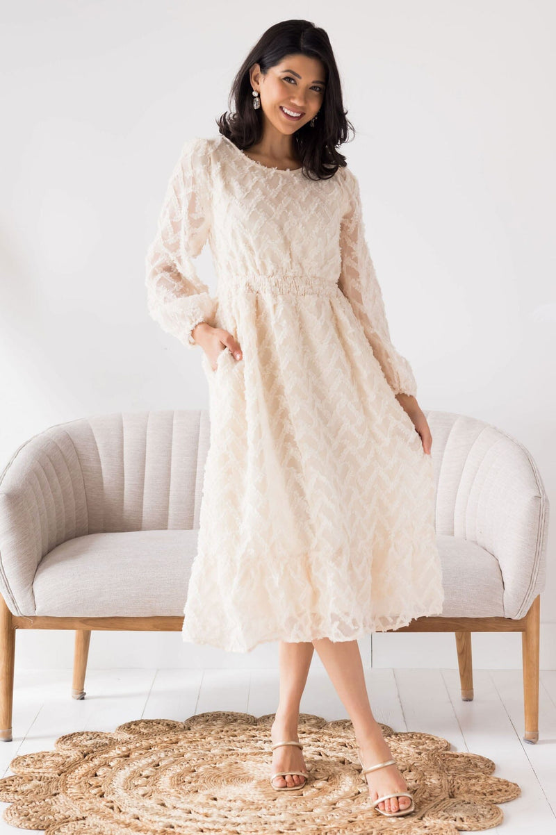 We run out of flattering words to use when describing the chevron textured Melrose! It's so flowy and feminine, the perfect addition to everyone's closet, for any season. Featuring a modest round neckline, long unlined sleeves, smocked waistline, pockets and the ever so lovely ruffle hem skirt. Just say yes to the dress and get it today!
