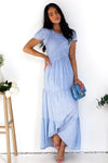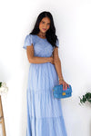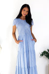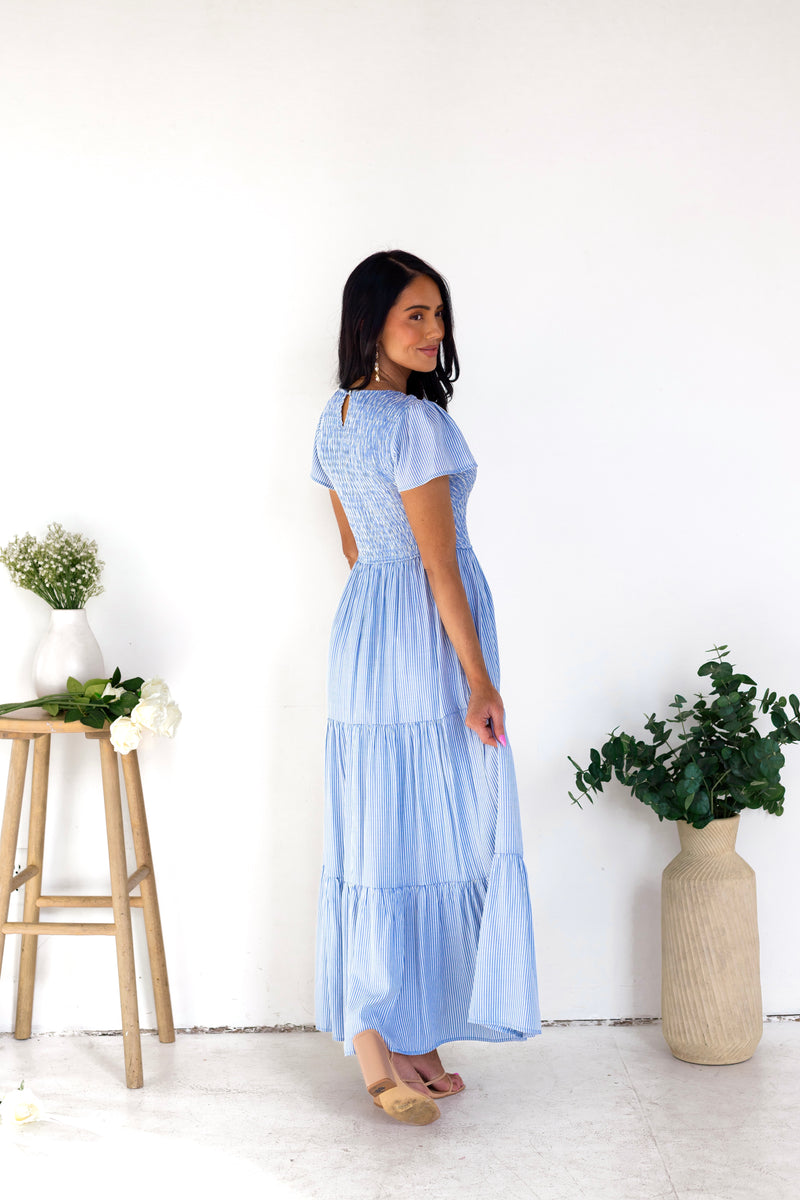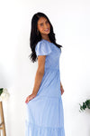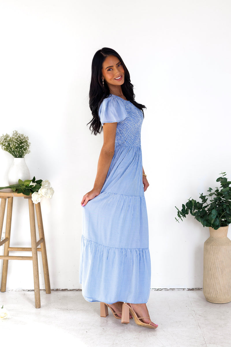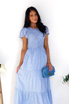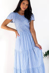 We love the new Minette Modest Dress! This gorgeous striped dress has so many wonderful features, such as short flutter sleeves, elastic waist, a tiered skirt, and a wonderful smocked bodice. The back of the dress also has a button clasp at the center back of the neck. The white stripes are a gorgeous contrast against the blue fabric. We love this dress and are sure you will too!
