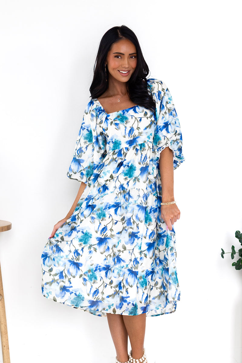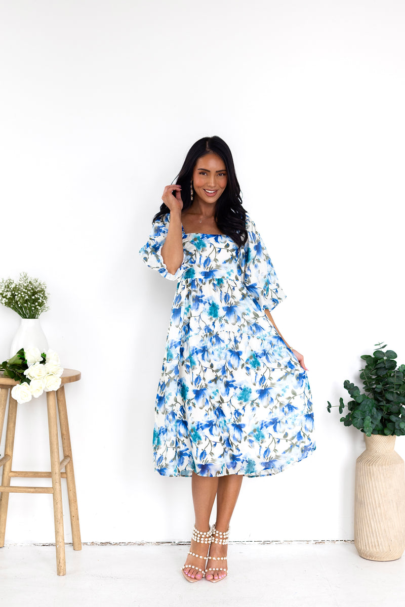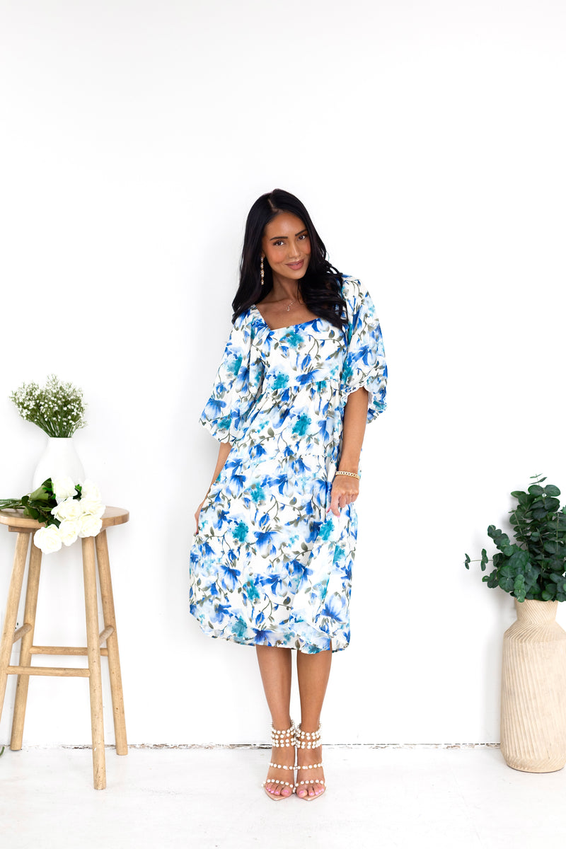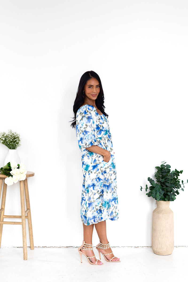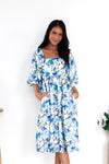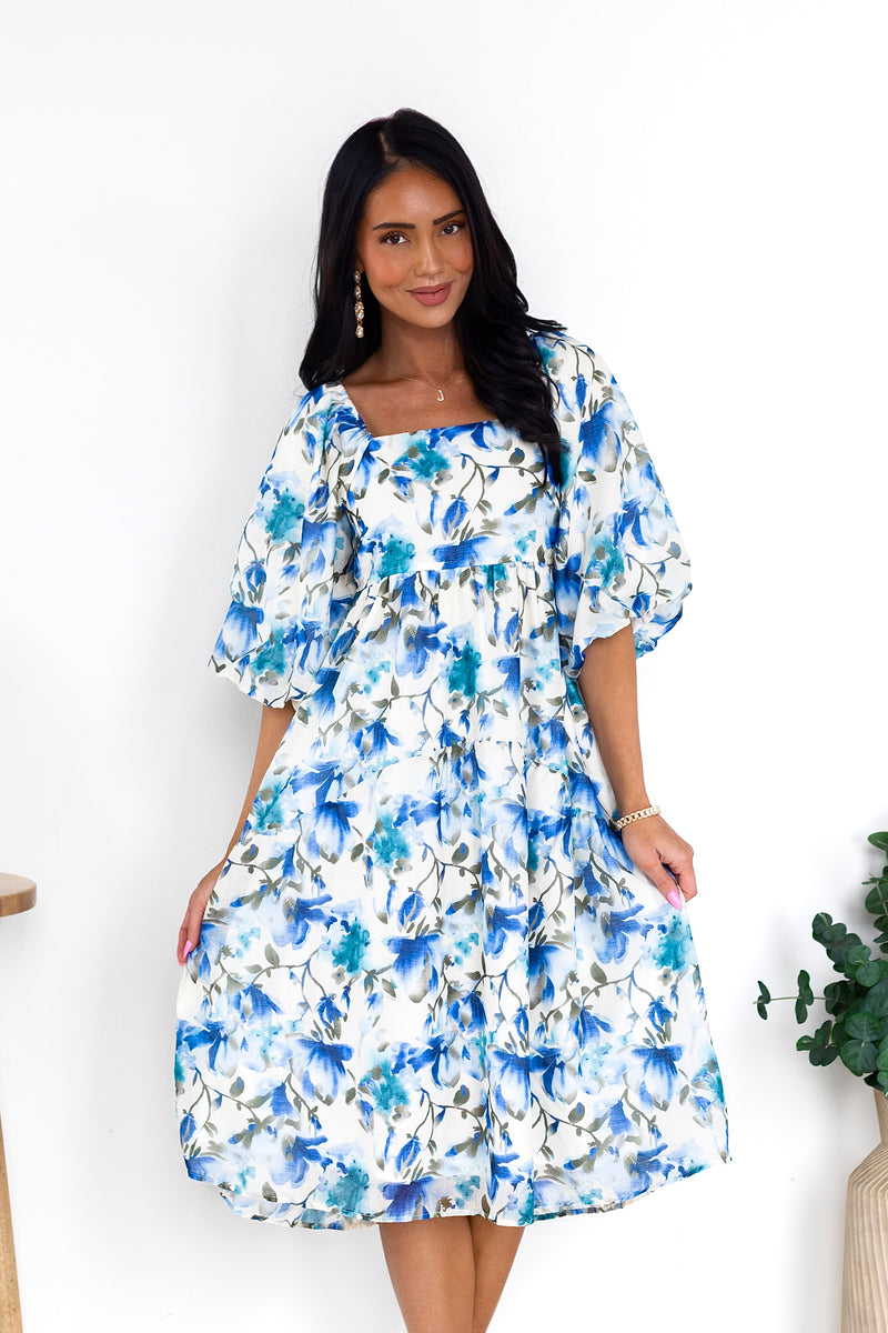 You'll love the lovely Isela as much as we do! This beauty has all the most elegant features to include a modest squared neckline, half length puff sleeves, pockets and we are obsessed with the feminine flowy skirt! Get yours today!