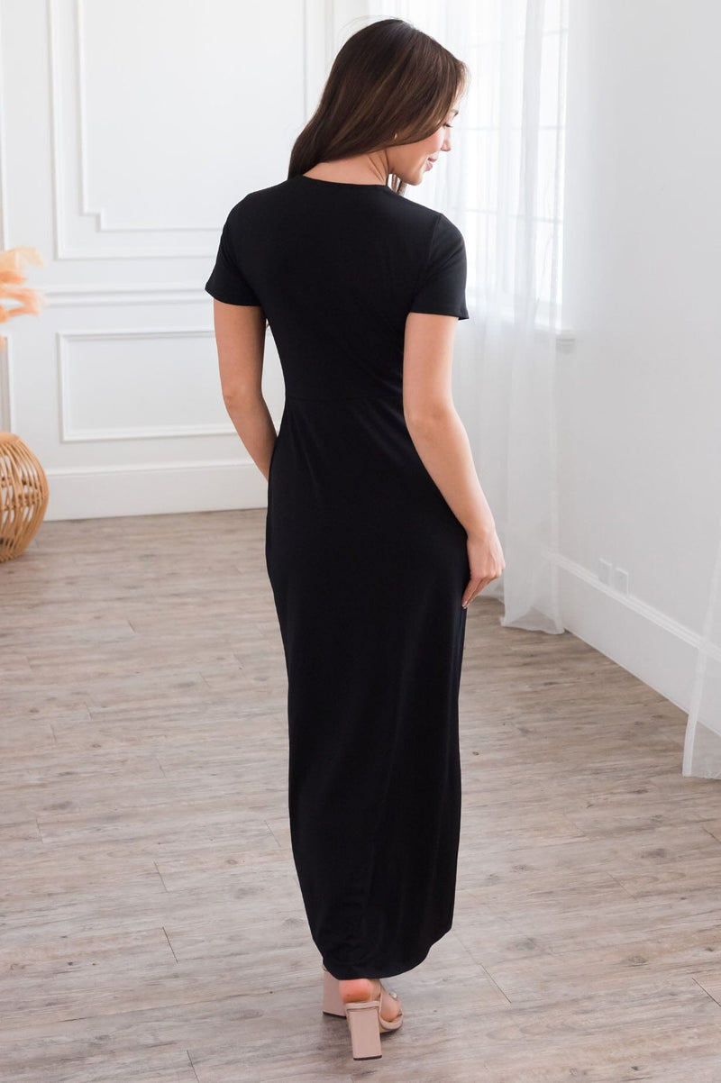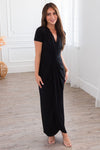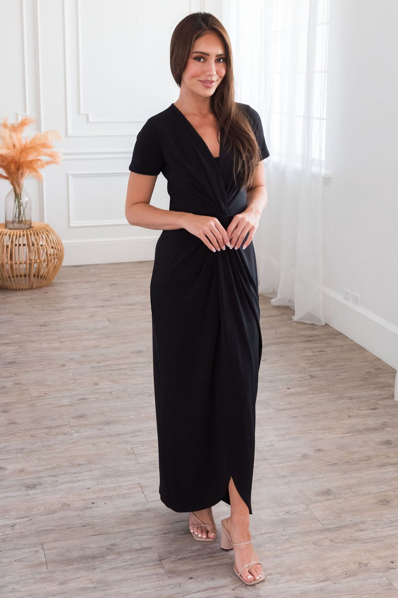 Black is always in season and the Kiana is as classy as they come! There is nothing not to love about this casual beauty. Featuring short sleeves, v-neckline, an elegant twist detailed waist and gorgeous maxi length wrap style skirt. This dress is a classy much have dress for every wardrobe!