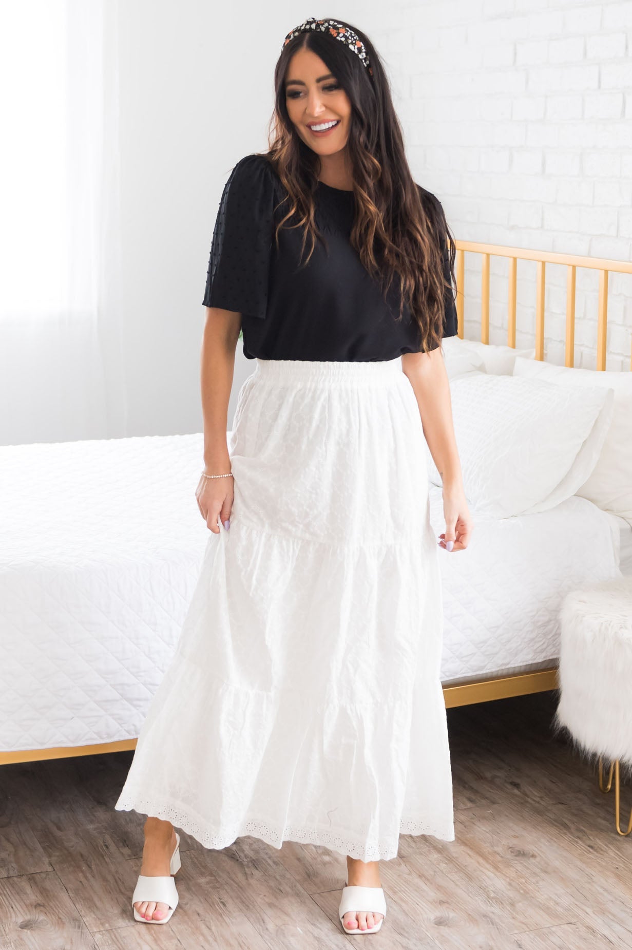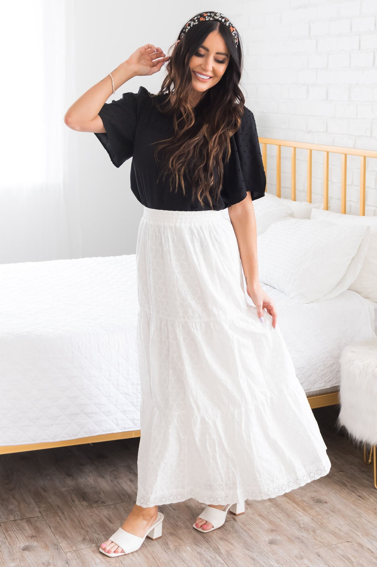 Summer time is here, which means, we need all the eyelet skirts around! This darling skirt is so perfect for everyone! Featuring an elastic waistline, tiered eyelet material and a gorgeous crochet lace trim detailing at the hemline.