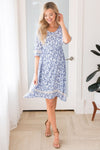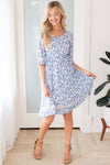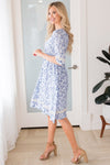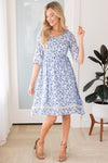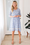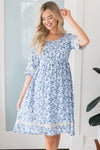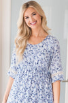 The Bexley Modest Midi Dress is here and ready to steal the show! It has a gorgeous navy and light steel blue floral print, a scoop neckline, and stunning hemline lace detailing on half-length sleeves! We love it and are sure you will too!