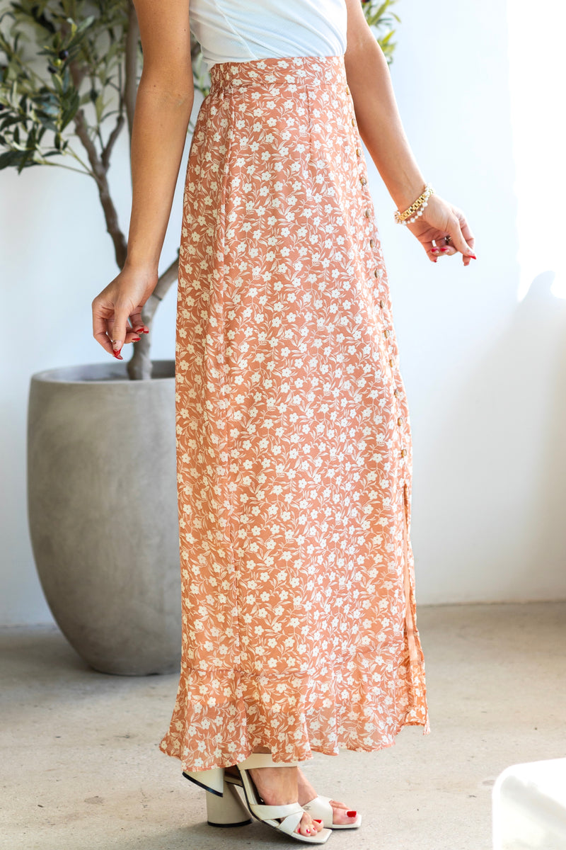 Are you ready for the most beautiful surprise? Well then, the perfect maxi has arrived just for you! Featuring a gorgeous floral print, elastic waistline with faux button front detailing, a modest front slit and the perfect maxi length. Trust us when we say add this flowy feminine skirt to your cart today! It won't last long!