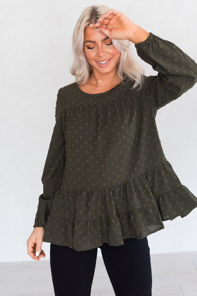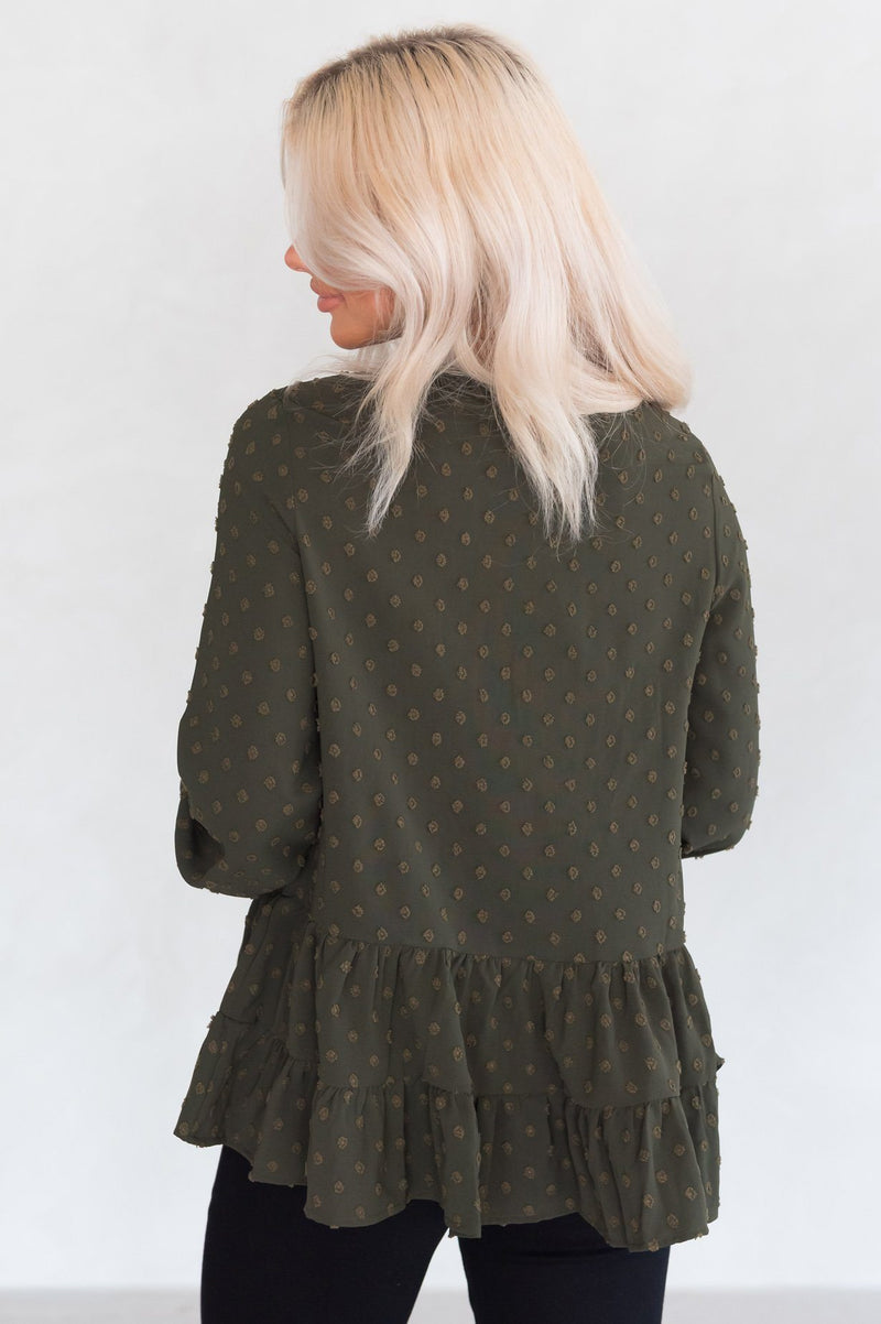 Ready for your new favorite fall blouse!? This gorgeous olive green blouse has swiss dot detailing throughout, a tiered bodice with a ruffled hem, and long sleeves! This cute blouse is the perfect addition to your fall wardrobe!