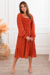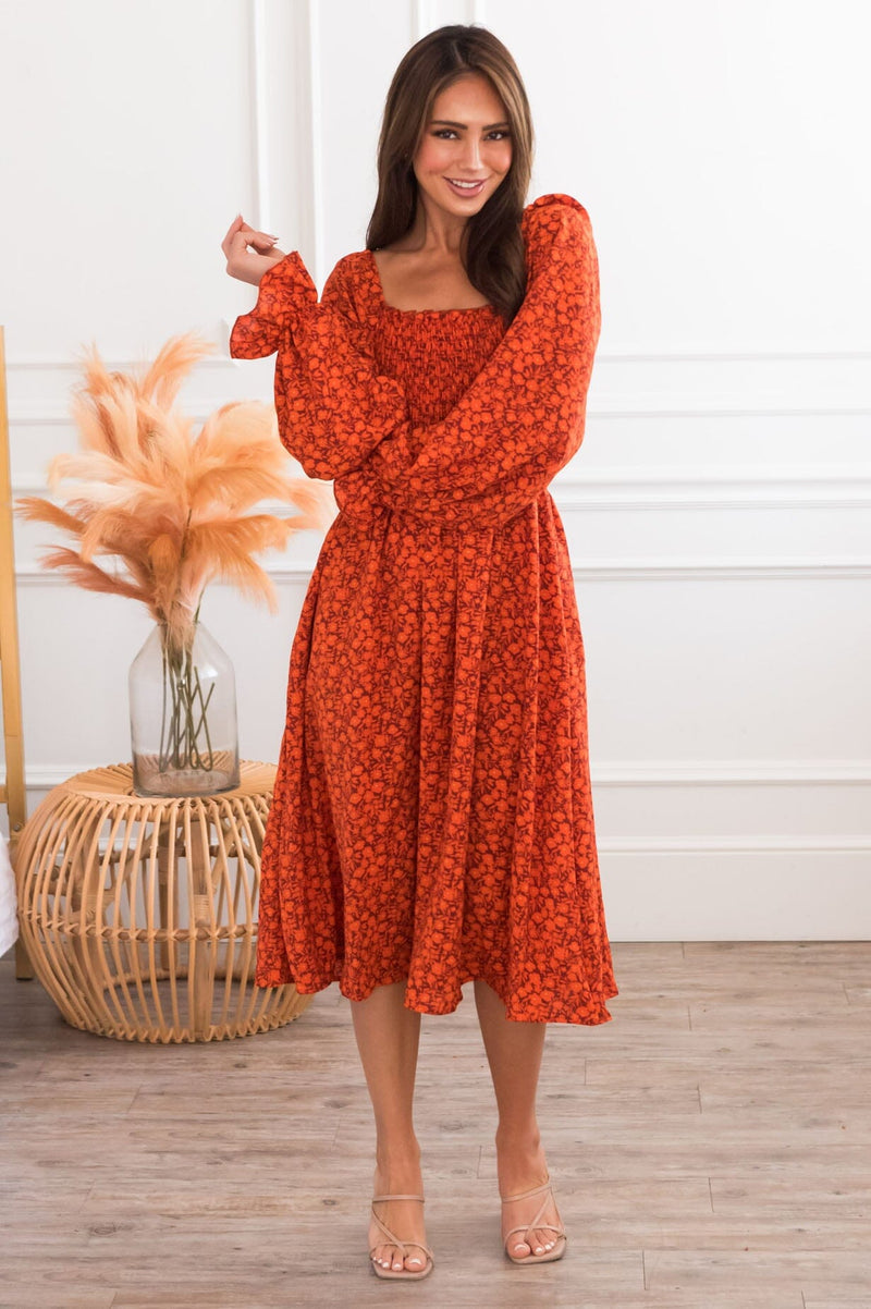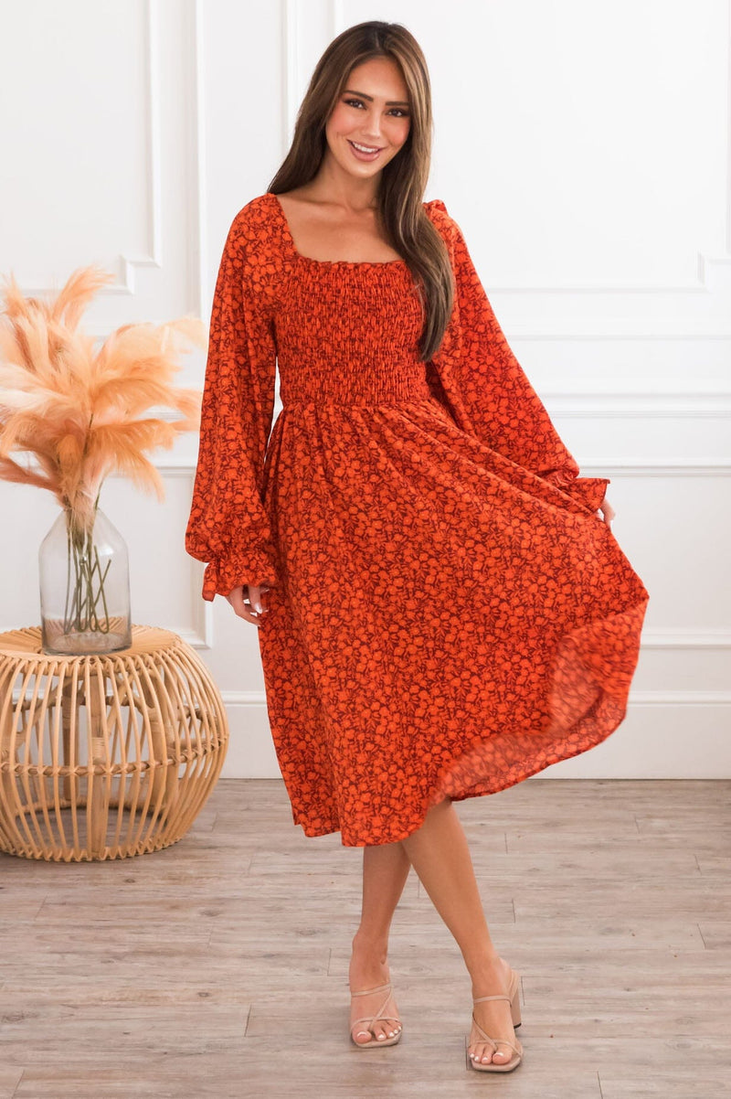 The Dimitria is a showstopper! We are so obsessed with this rust & tangerine floral beauty! The classy square neckline, smocked bodice, long ruffled cuff sleeves, and perfect length skirt. Get yours today!
