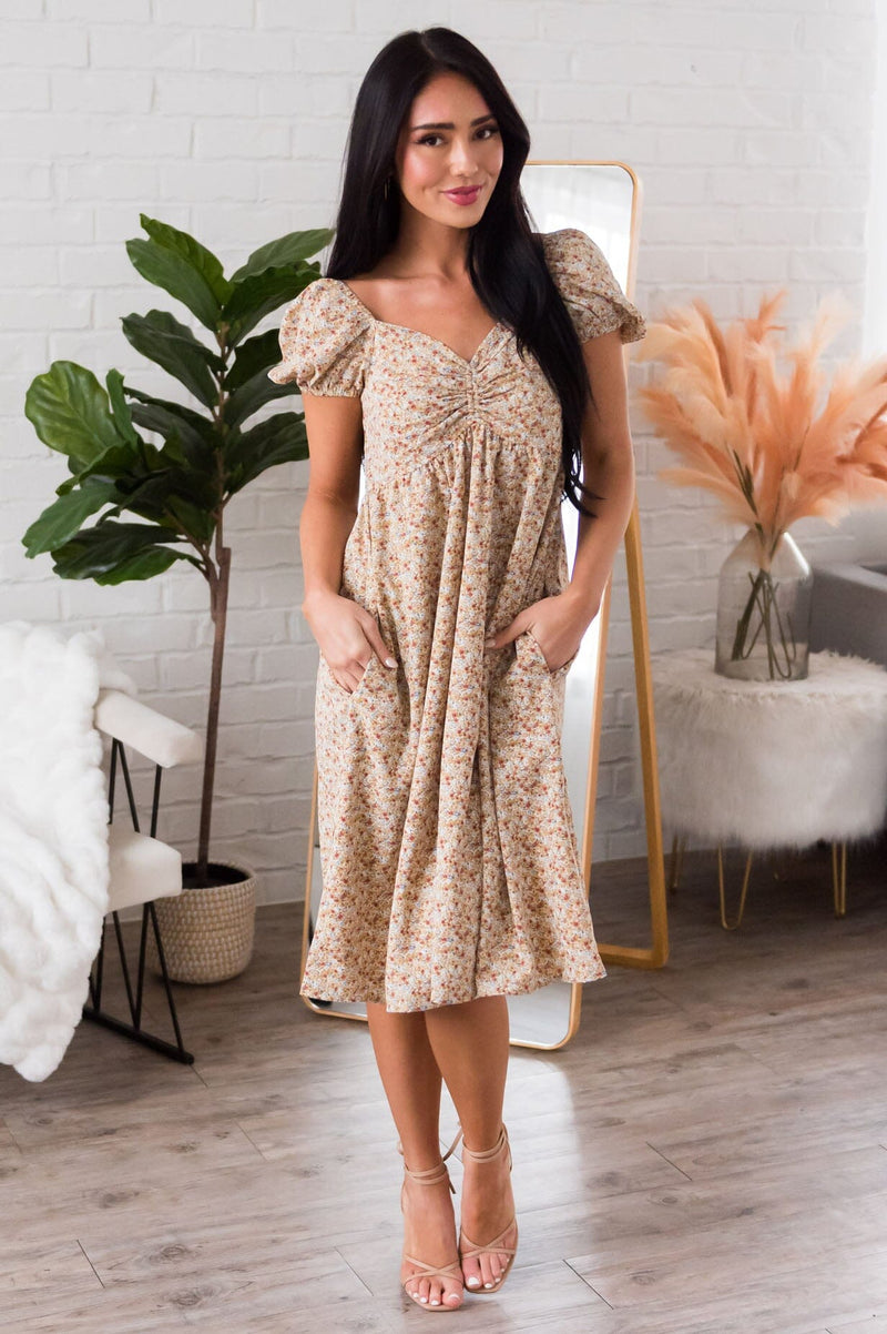 We couldn't have dreamt up a more lovely dress if we tried! The Arizona is so adorable, classy and modest all in one! Featuring short puff sleeves, sweetheart neckline with ruched detailing, pockets and a flowy mid-length skirt. Not to mention the prettiest yellow floral around! Get yours today!