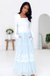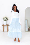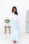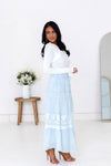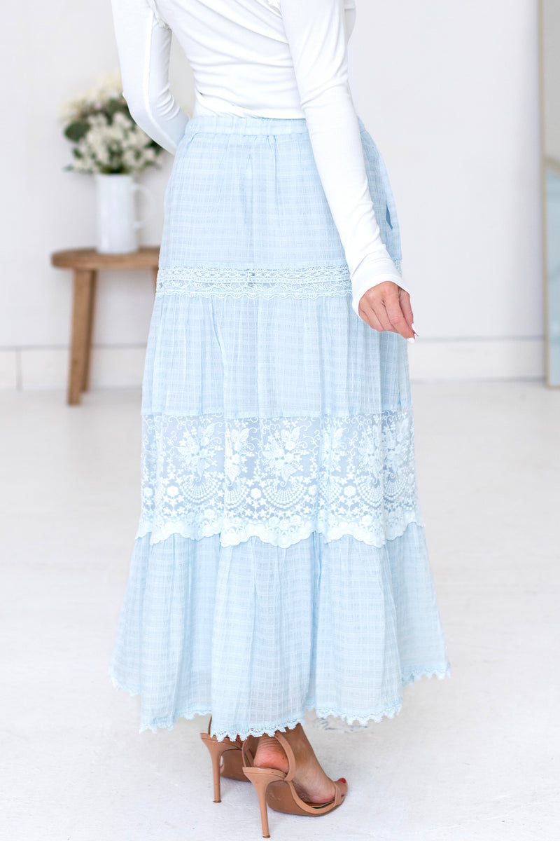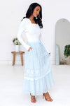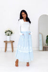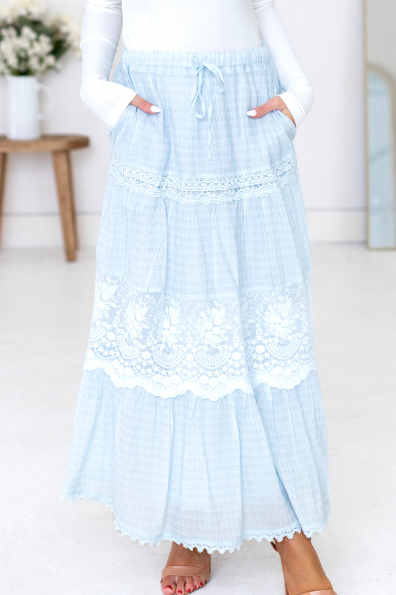 Be adorable and sweet as can be in the new Layered In Lace Maxi! Featuring the most elegant lace and embroidery detailing, elastic tie waistline, pockets and the most lovely pale blue color. Get your perfect Spring skirt now before they're gone!