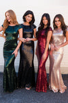 The lovely Merrily will help you be the cheeriest at the holiday party this year or ring in the New Year with a little bling! The sophisticated & classy Merrily is just that with a lot of sparkle! This dress features a high modest neckline, stunning sequins from head to toe and short sleeves. Sure to make everyone do a double take at this elegant shimmering beauty!
