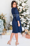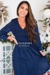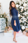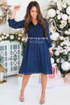 Our new Symphonie dress is seriously perfection! We are loving the modest v-neck line with shirred bodice detail and the gorgeous deep navy shimmer fabric, it adds the perfect touch for any occasion. Add the perfect pair of booties and your favorite accessories to create a statement look! This dress is also lined.
