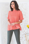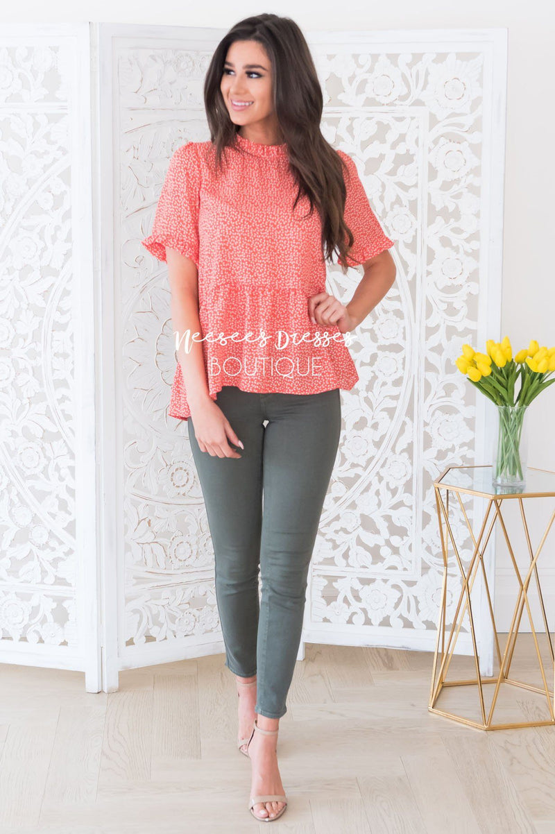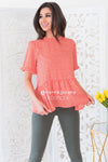 We love the New Lift My Spirit Modest Peplum Blouse, this beauty is so flowy and feminine! It is a summertime must have! Featuring modest ruffle neckline, short ruffle sleeves, peplum style and a keyhole button closure.
