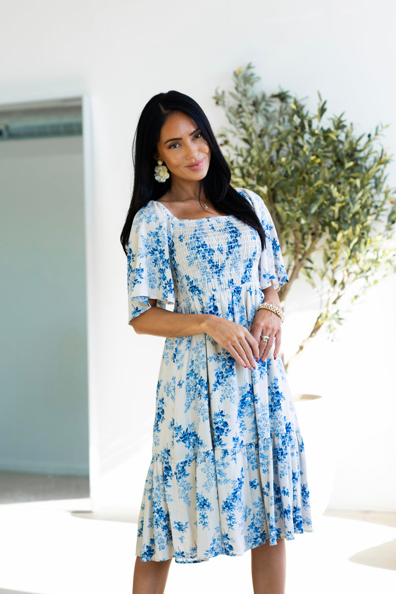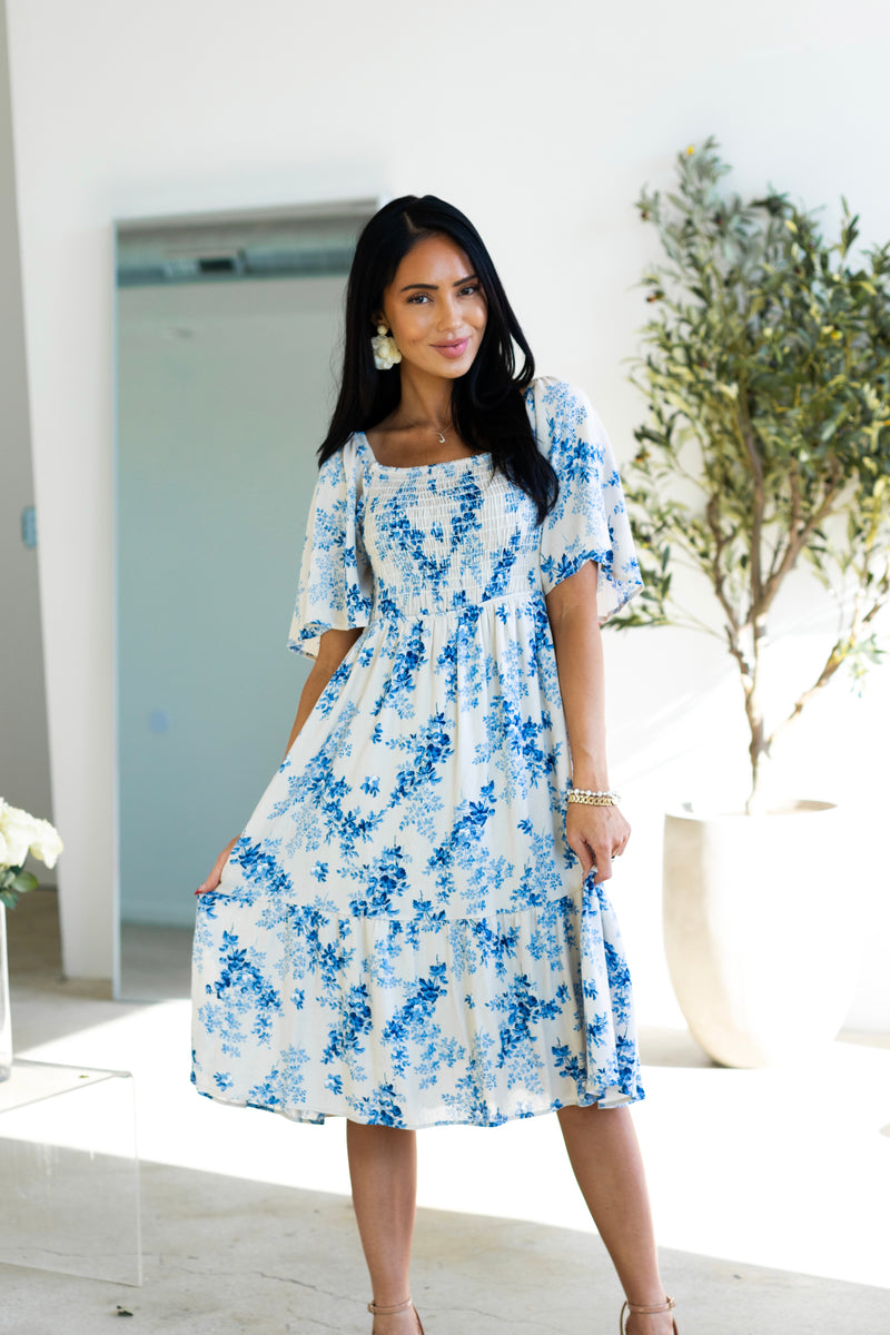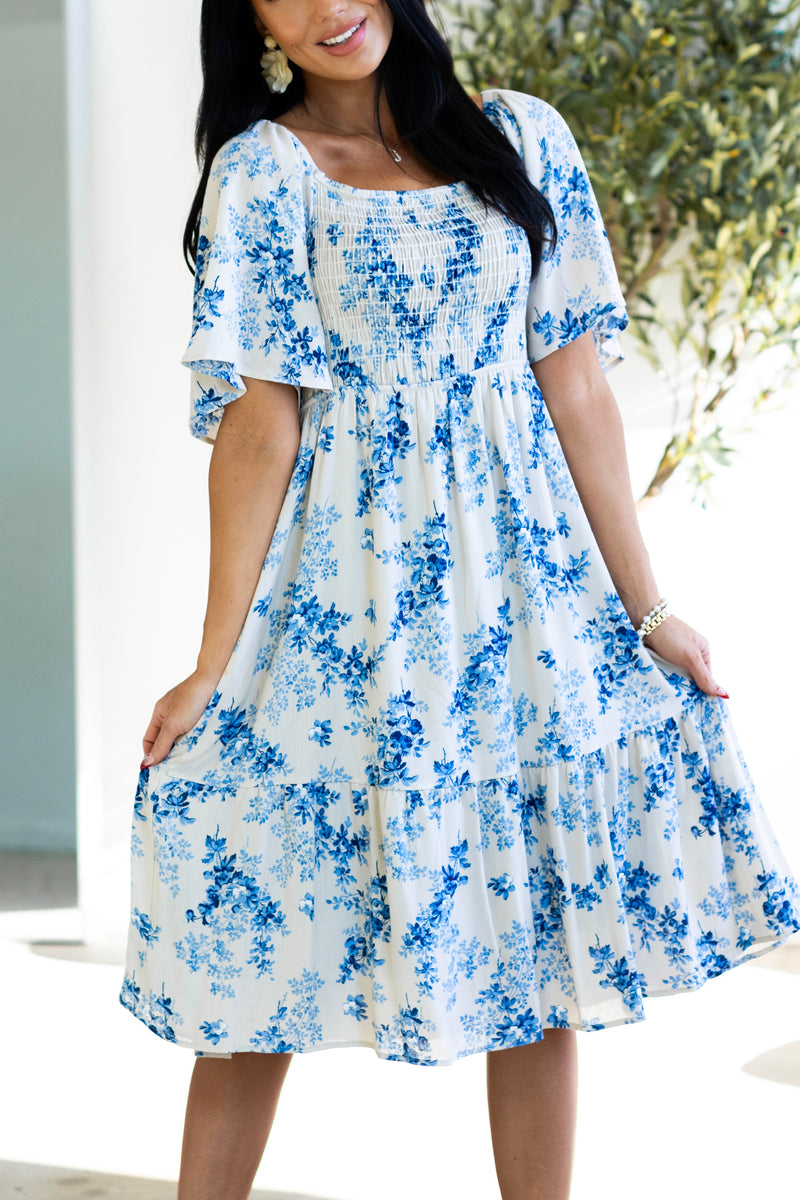 The new Kansas dress will be nothing but darling on you! The gorgeous floral is a beautiful addition to any wardrobe! We are so in love with the flattering smocked bodice with squared neckline, half flutter sleeves, empire fit and perfect length skirt! This is the perfect grab your favorite jean jacket and go type of dress!