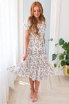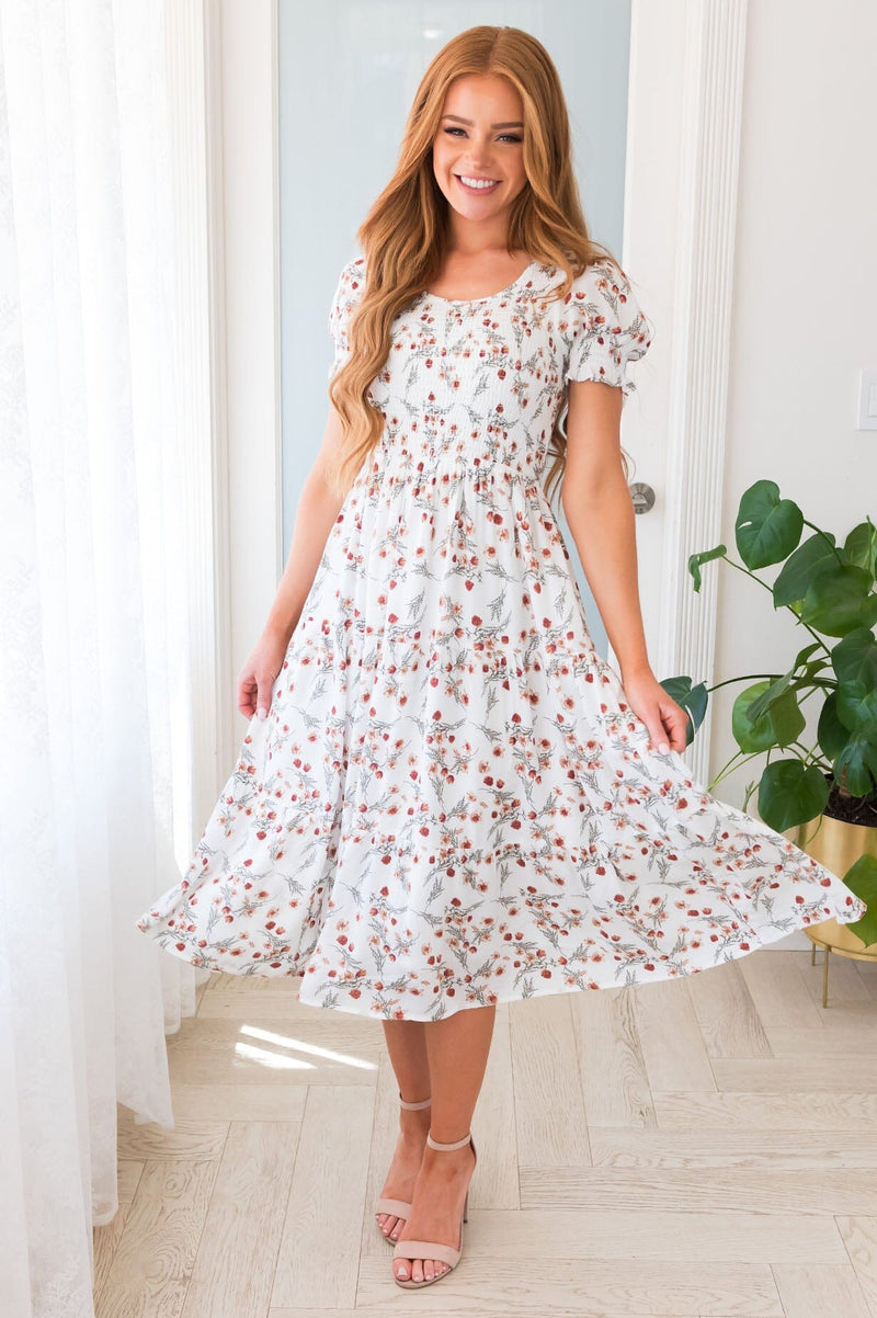 This lovely ivory & burnt cidar floral pattern dress is breathtaking! We are so in love with the elegance of this dress with its classy short puff sleeves and tiered ruffle skirt this dress it's absolutely perfect for Spring! Get yours today, these beauties will go fast!