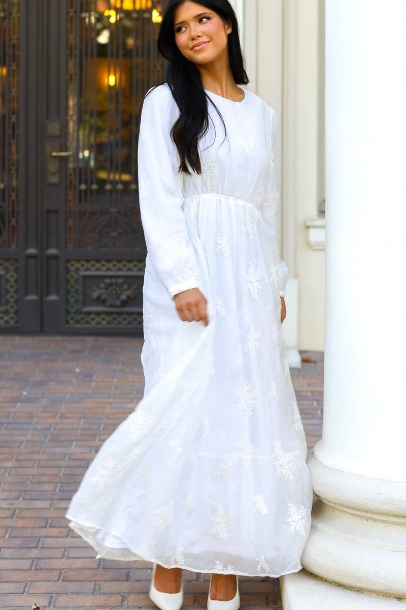Sheer bliss is all we could think of when we saw the new Adea! Featuring feminine sheer fabric with delicate embroidery detailing throughout. Modest rounded neckline with keyhole button back closure, long sleeves, pockets and a perfect length flowy ruffle hem skirt. Get this temple worthy beauty today!