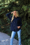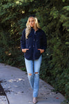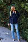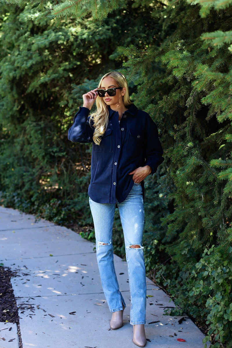 This Fall's "It Girl" jacket has arrived! This classy cozy shacket has a collared neckline, functional button front with front bodice pockets, button cuff long sleeves and a gorgeous navy color. You will not regret adding this beauty to your wardrobe so add to cart now!